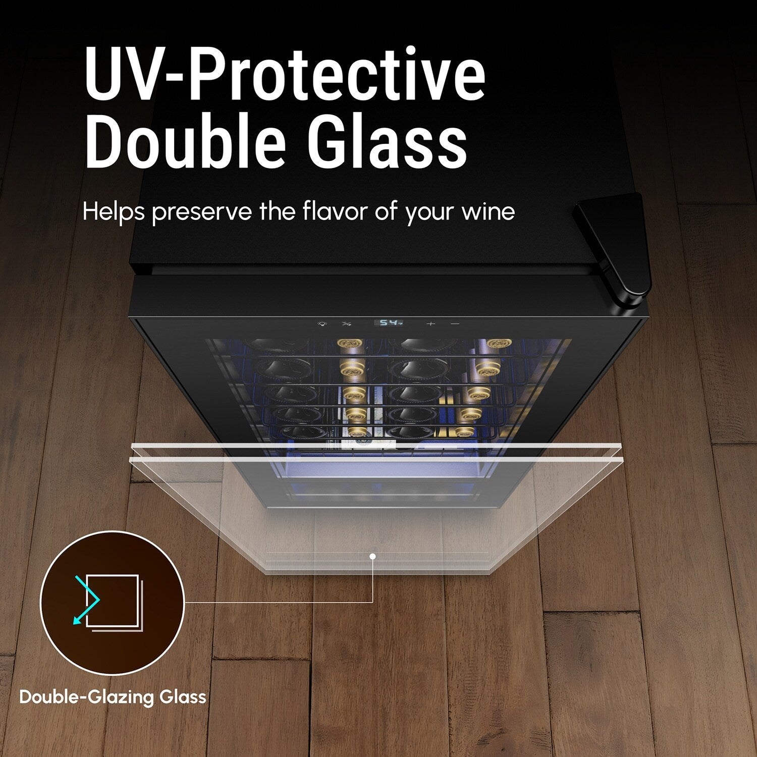 • Préservez la qualité de votre vin grâce à notre porte vitrée à double vitrage anti-UV. Cette fonction bloque les rayons UV nocifs, préservant ainsi la saveur et l'arôme de votre vin.