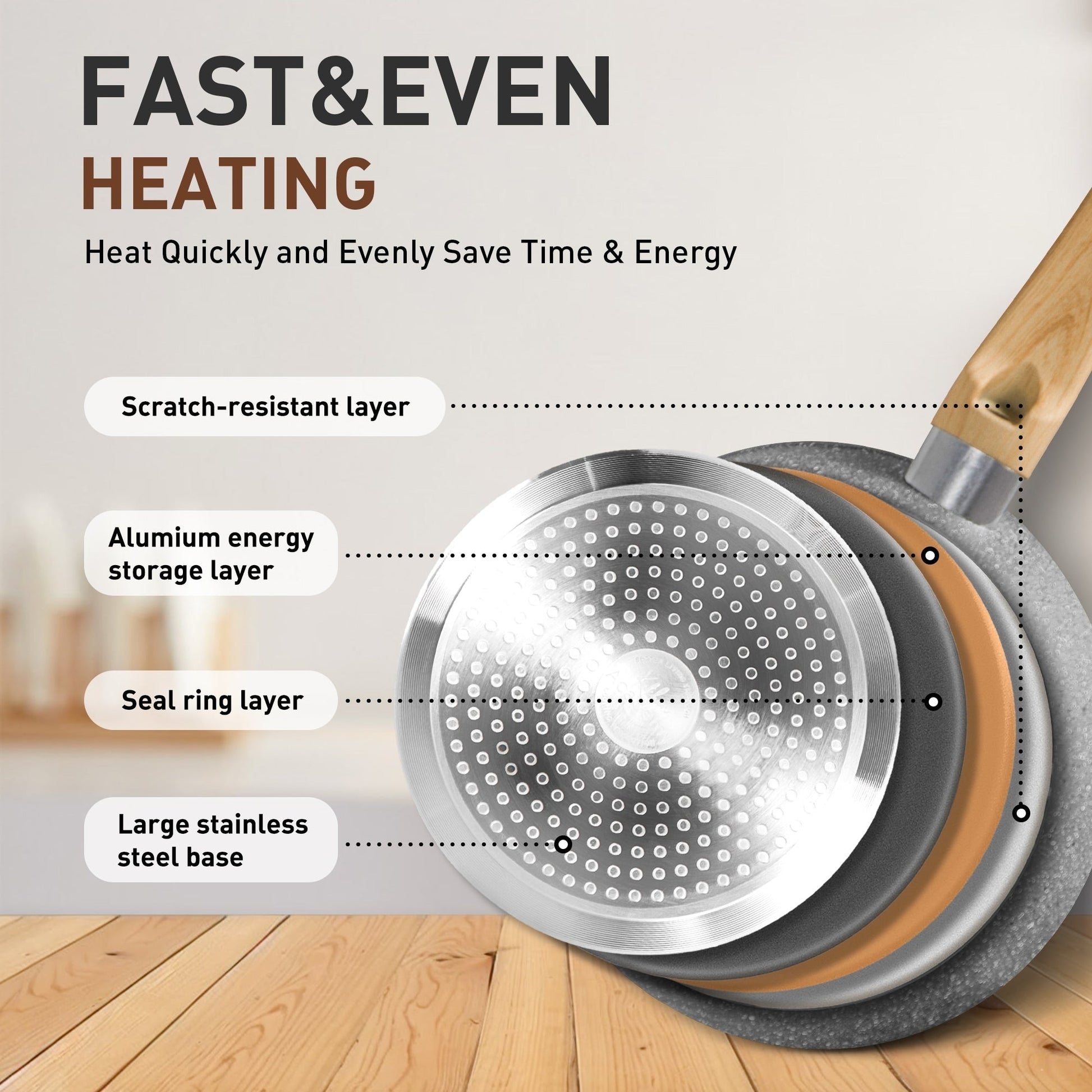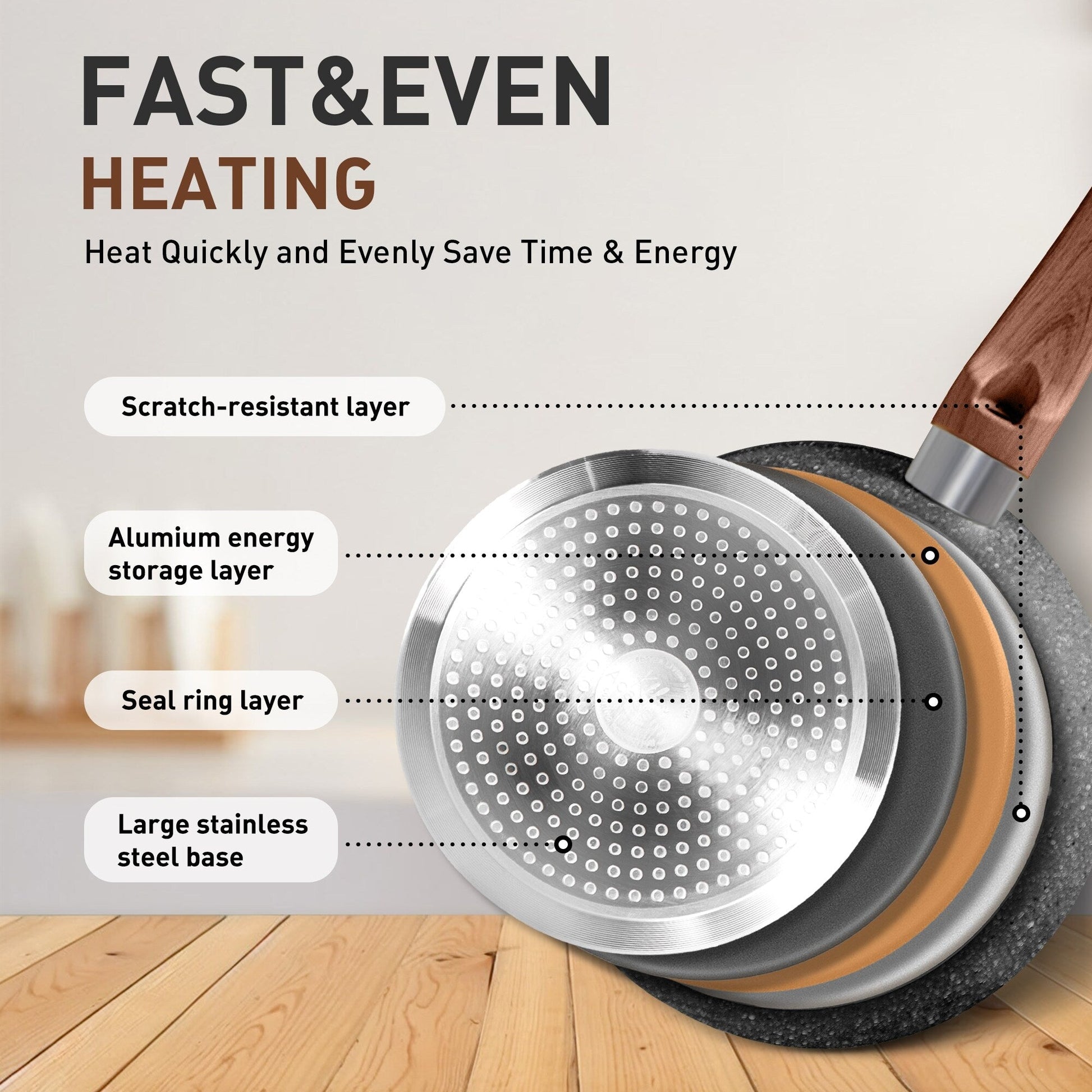 Batterie de cuisine antiadhésive : Lors de l'achat d'ustensiles de cuisine, l'un des critères les plus importants est la qualité antiadhésive. Le revêtement en granit empêche efficacement les aliments d'attacher. De plus, vous pourrez cuisiner des repas plus sains pour votre famille, car vous utiliserez moins d'huile. Vous pouvez cuire de la sauce tomate en toute sécurité dans des ustensiles de cuisine en granit ; le goût et l'odeur de vos aliments ne seront pas altérés, même avec des ingrédients acides ou à forte odeur.