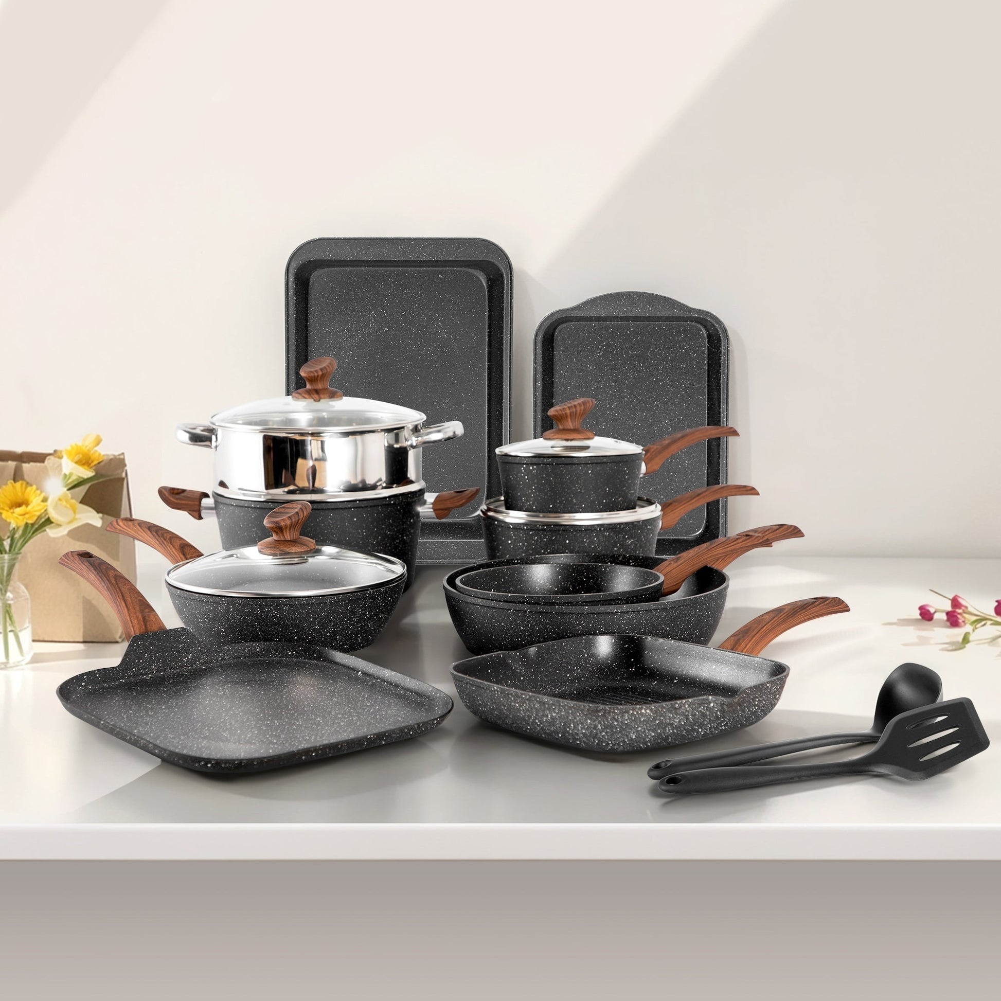 Batterie de cuisine en granit de 17 pièces, ensemble de casseroles et poêles antiadhésives