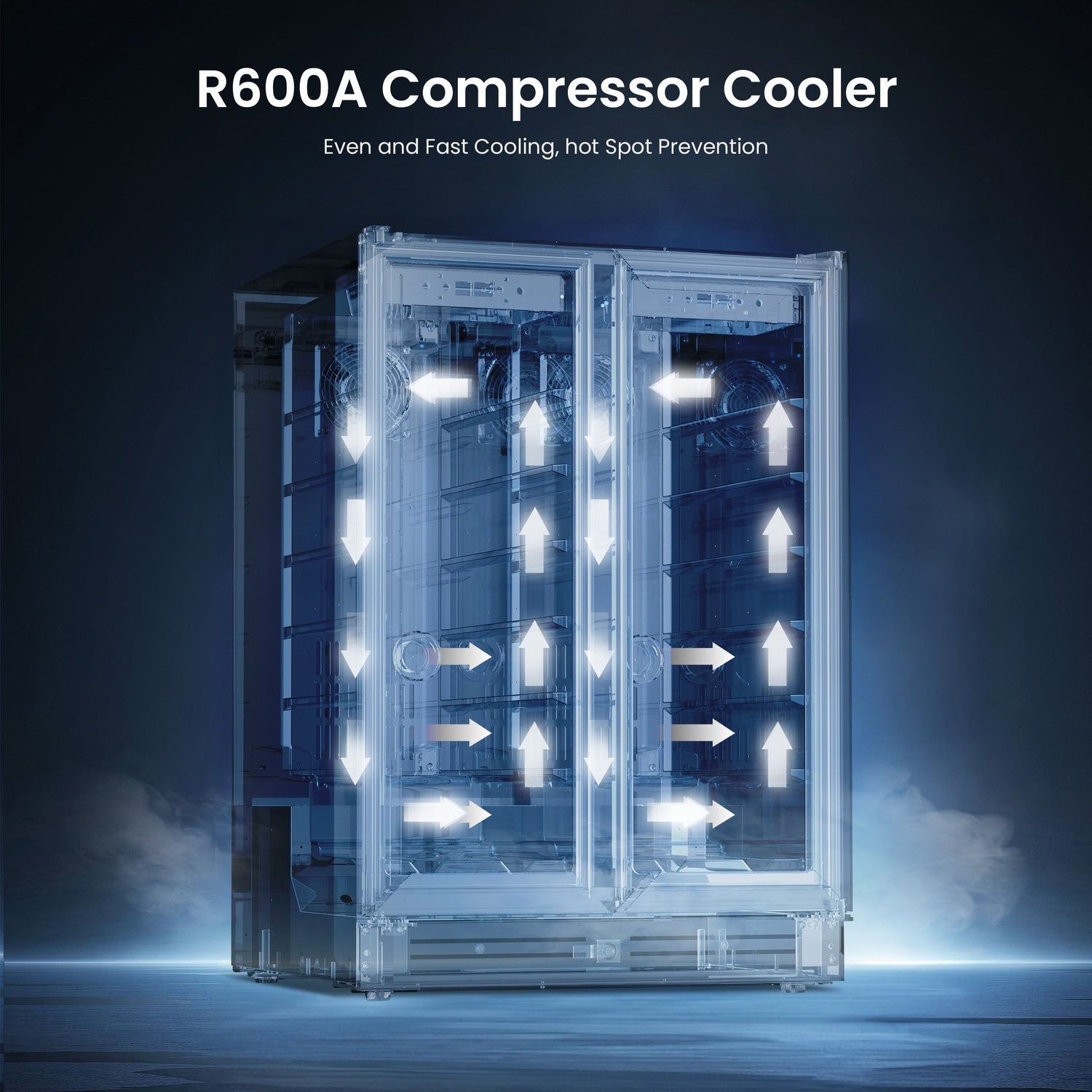 - Refroidissement écologique et efficace : Doté du réfrigérant R600a et certifié DOE, le refroidisseur à vin et boissons Yeego offre un refroidissement rapide et homogène tout en économisant de l'énergie. Le système de ventilation frontale améliore la circulation de l'air et la dissipation de la chaleur, tandis que le filtre à charbon actif élimine les odeurs, préservant ainsi la fraîcheur de l'intérieur.