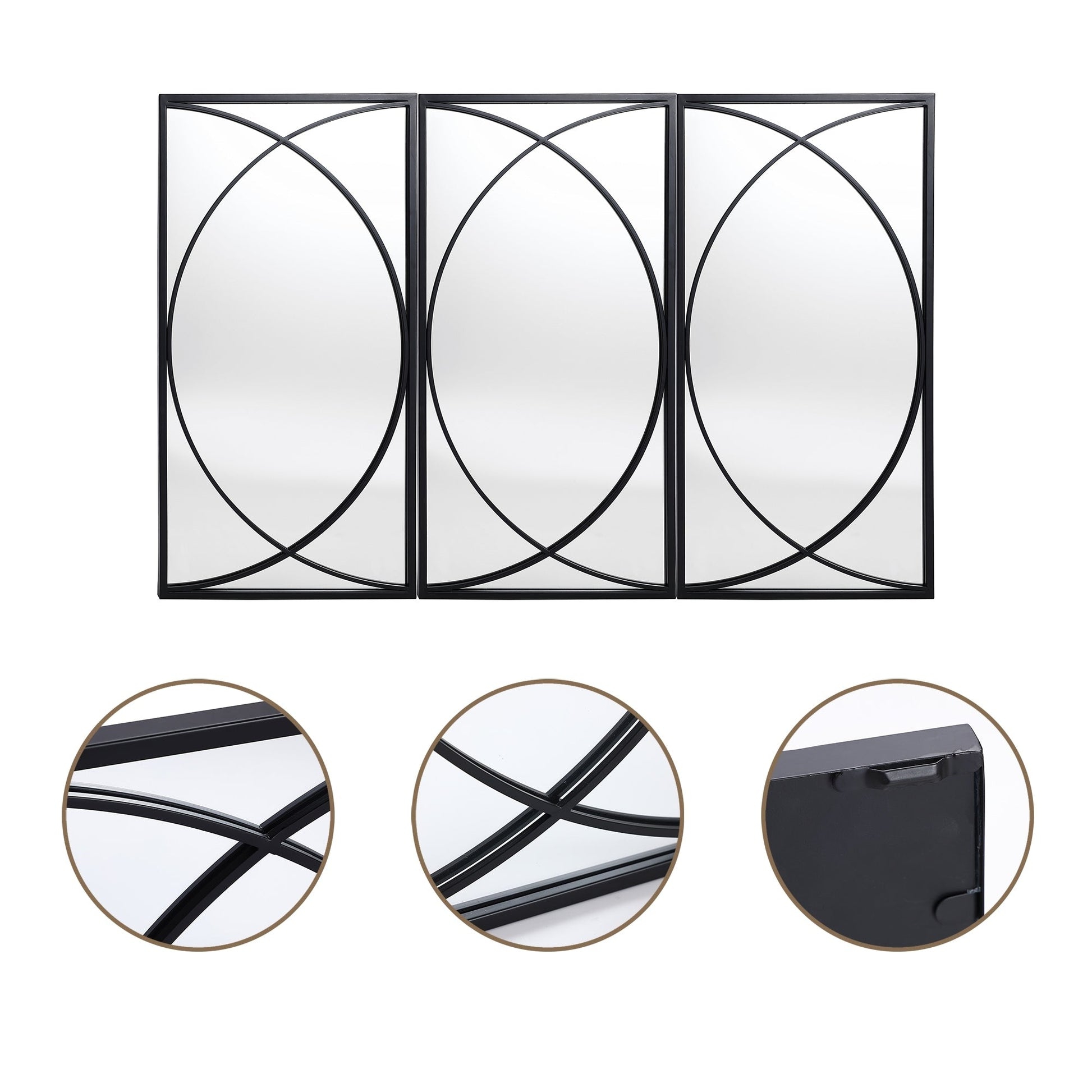 Sublimez votre espace de vie avec ces miroirs muraux rectangulaires en métal noir de qualité supérieure. Cet ensemble comprend trois miroirs au design contemporain, à disposer ensemble ou séparément pour personnaliser votre décoration. Leur surface en verre de haute qualité offre des reflets cristallins, parfaits pour un usage aussi fonctionnel que décoratif. Leur design moderne et élégant, composé de deux demi-cercles se croisant au milieu, vous permet de les agencer selon vos envies et votre créativité.