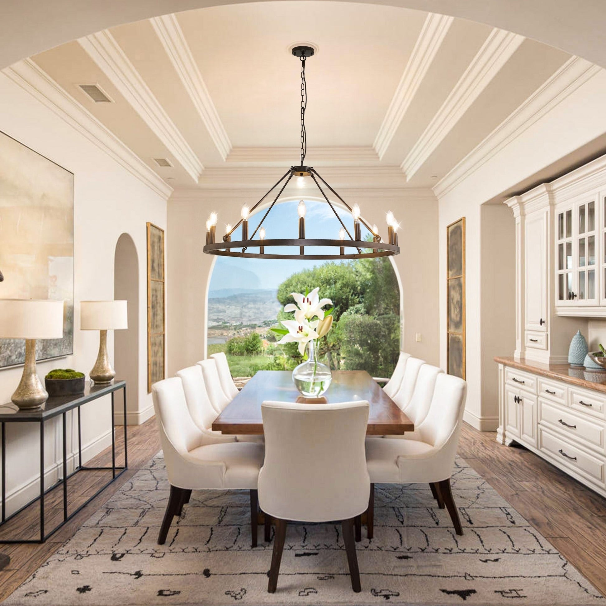 Ajoutez une touche de style campagnard moderne à votre intérieur avec ce lustre rond de 137 cm à 24 lumières en forme de roue de chariot. Fabriqué en métal robuste et disponible en plusieurs finitions, ce lustre arbore un charmant design en forme de roue de chariot qui ne manquera pas de faire sensation. Avec ses 24 ampoules et sa taille généreuse, ce luminaire offre une lumière abondante pour les grandes pièces et est parfait pour créer une atmosphère chaleureuse dans n'importe quel espace.