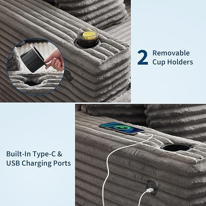 [Confort et espace détente] Profitez d'une détente exceptionnelle avec cette chaise longue surdimensionnée, dotée d'une largeur généreuse de 137 cm et d'une profondeur d'assise de 119 cm. Idéale pour la lecture, la sieste ou les soirées cinéma, elle offre un espace généreux pour vous et vos proches. Son design spacieux garantit une assise haut de gamme, ce qui en fait un ajout idéal aux salons, chambres et espaces de divertissement. [Revêtement en velours côtelé durable et de qualité supérieure] Fabriqué en velours côtelé respirant de haute qualité, ce canapé-lit allie luxe et durabilité. Sa texture douce procure une sensation de confort, tandis que la mousse haute densité et les ressorts ensachés à l'intérieur maintiennent la forme du fauteuil et offrent un soutien moelleux. Que vous jouiez, vous détendiez ou vous reposiez, le revêtement haut de gamme offre un confort et un style durables. [Soutien ergonomique complet] Conçue pour votre confort, cette chaise longue surdimensionnée est dotée d'une assise profonde et ergonomique qui soutient tout votre corps. Cela favorise la détente pour lire, méditer ou se détendre après une journée bien remplie. La structure du fauteuil favorise une posture saine et réduit la fatigue, vous procurant une sensation de fraîcheur et de confort même pendant une utilisation prolongée. [Pratique et pratique] Restez connecté sans effort grâce aux ports de charge intégrés au fauteuil-lit, qui vous permettent de recharger vos appareils tout en restant allongé. Les porte-gobelets amovibles sont pratiques et vous permettent de savourer vos boissons préférées sans avoir besoin de meubles supplémentaires. Ces fonctionnalités bien pensées optimisent votre détente, idéales pour lire ou regarder la télévision. [Assemblage simple et design moderne et élégant] Cette chaise longue moderne est facile à installer grâce à un processus d'assemblage simple, pour une détente immédiate. Son design élégant et contemporain s'intègre à une variété de styles d'intérieur, apportant sophistication et confort à tout espace. Que ce soit dans un salon, un bureau ou une chambre, c'est une solution d'assise élégante et pratique.