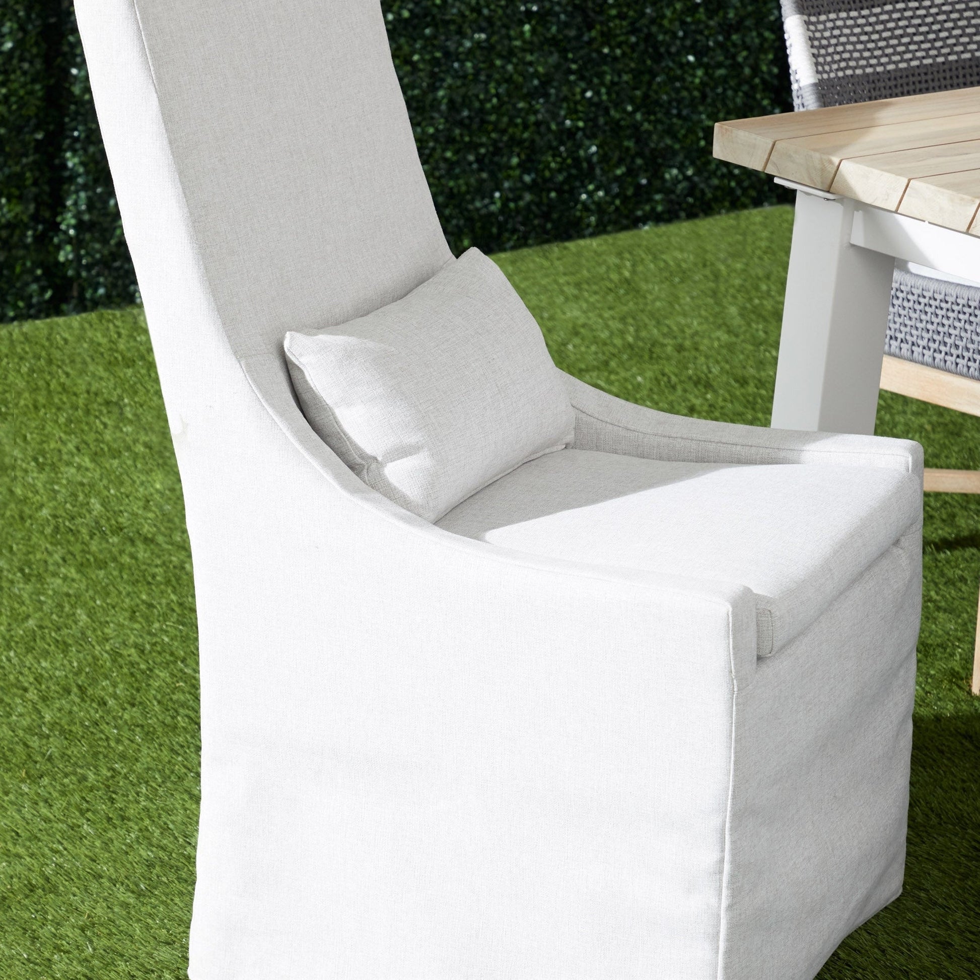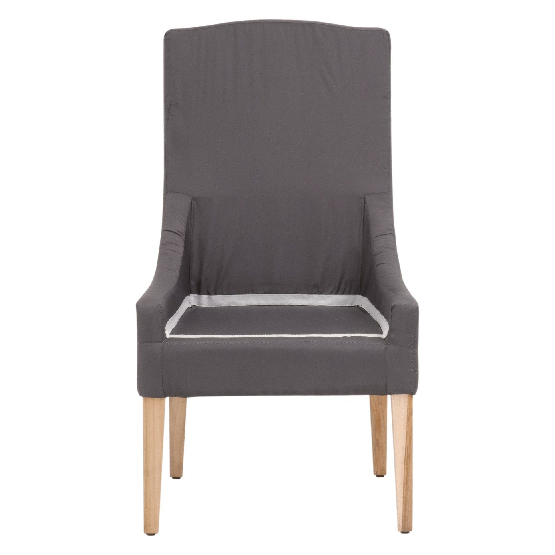 La chaise de salle à manger d'extérieur Adele, avec housse, allie confort sur mesure et durabilité en extérieur. Reposant sur un piètement en teck gris massif, cette chaise est dotée d'une housse amovible en oléfine haute performance, conçue pour résister aux intempéries, à la décoloration et à un usage quotidien.