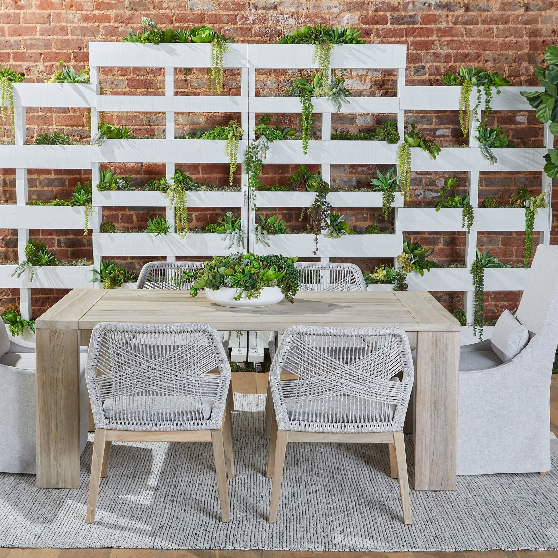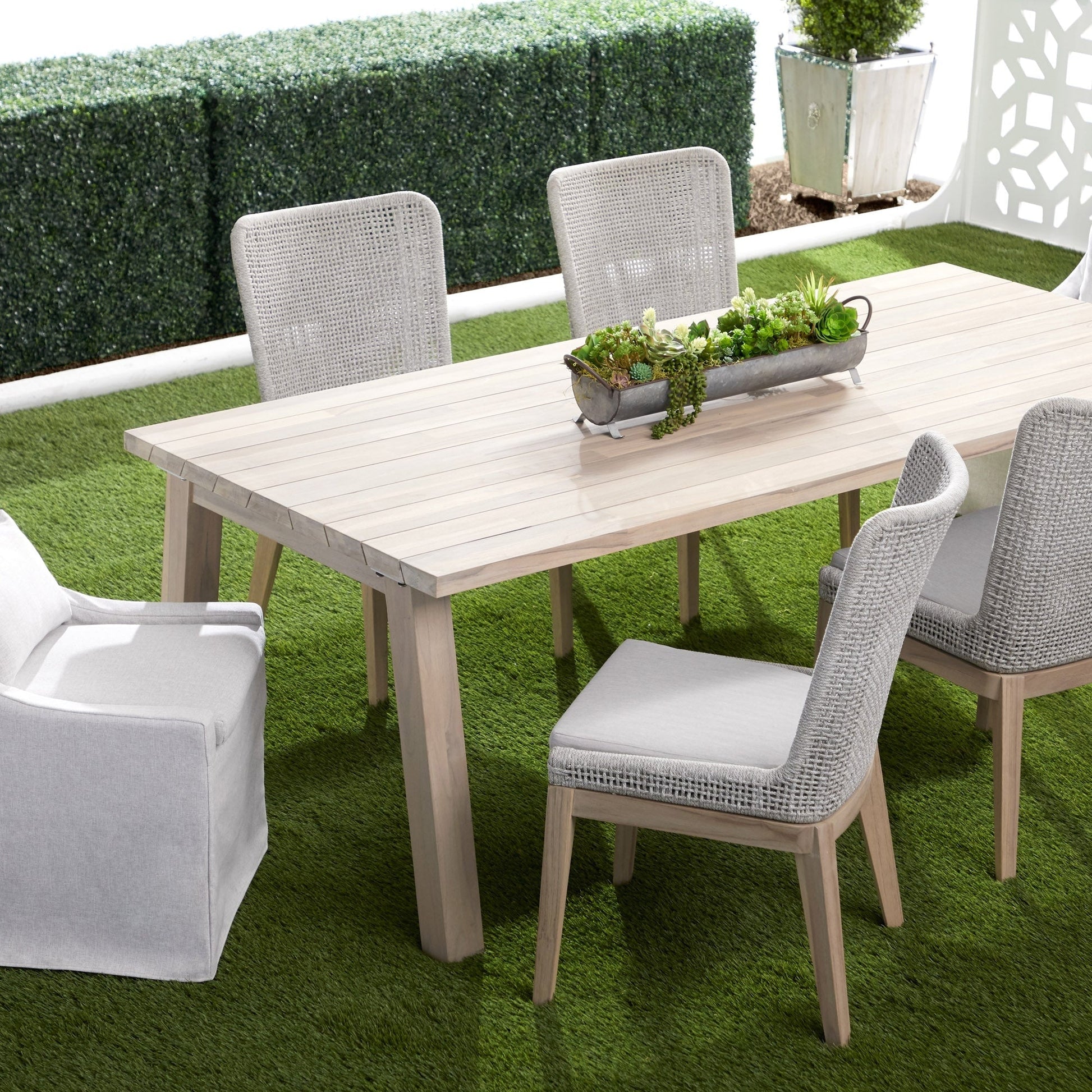 Remarque : Le piètement en teck gris est réalisé en teck massif, traité avec une solution qui accélère son vieillissement naturel et lui confère une patine gris argenté. Ce vieillissement peut entraîner de subtiles variations de texture, de couleur et de marques au fil du temps, qui contribuent à son caractère unique.