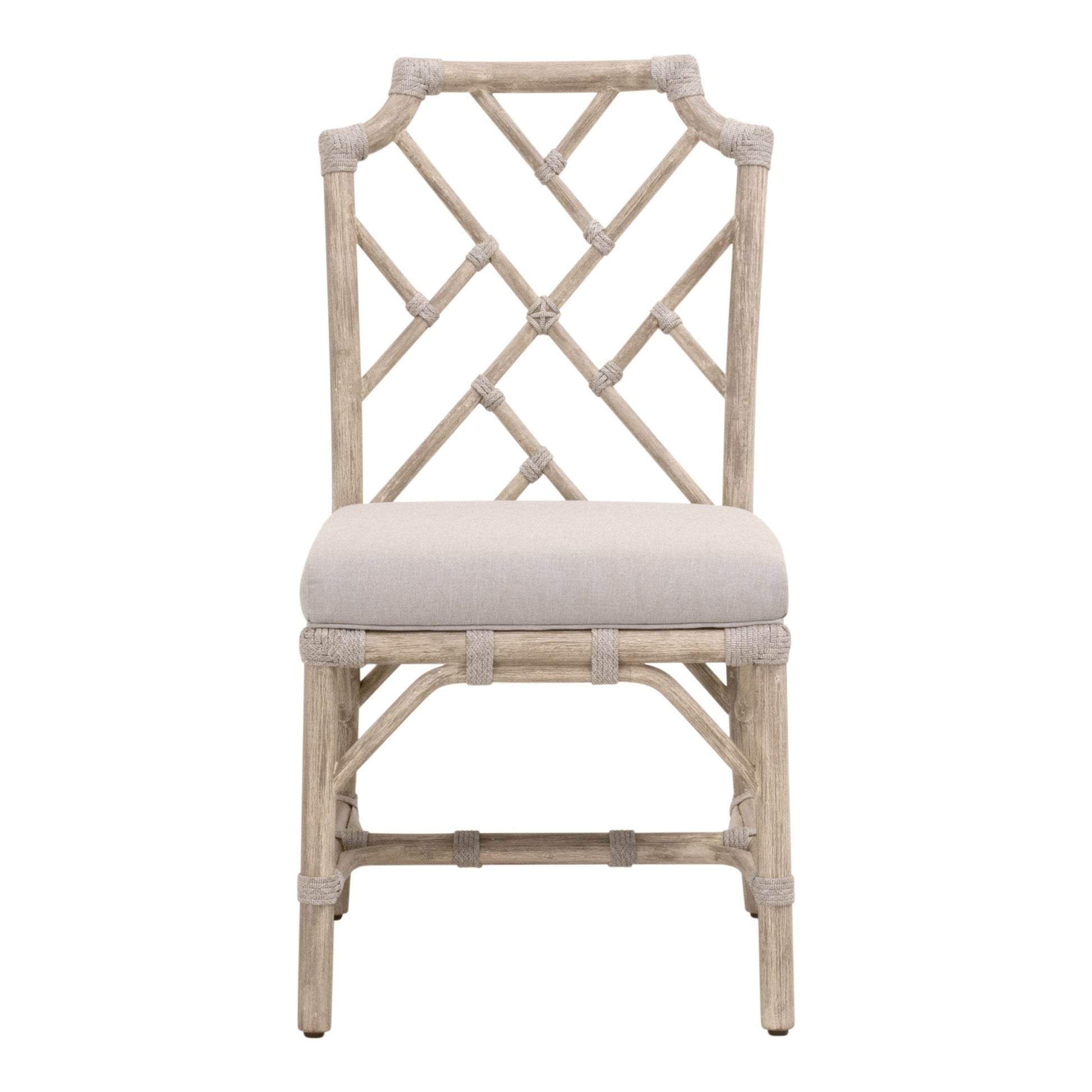 Sublimez votre salle à manger avec l'élégance décontractée de la chaise Bayview d'Essentials For Living. Fabriquée en acajou massif et soigneusement enveloppée à la main de corde taupe et blanche, cette chaise présente un dossier ouvert distinctif évoquant le charme côtier et tropical. Le coussin d'assise fixe est recouvert d'un tissu oléfine haute performance, offrant confort, durabilité et résistance aux taches. Alliant savoir-faire artisanal et textures légères, cet ensemble de deux chaises apporte chaleur, style et sophistication décontractée à toute salle à manger.
