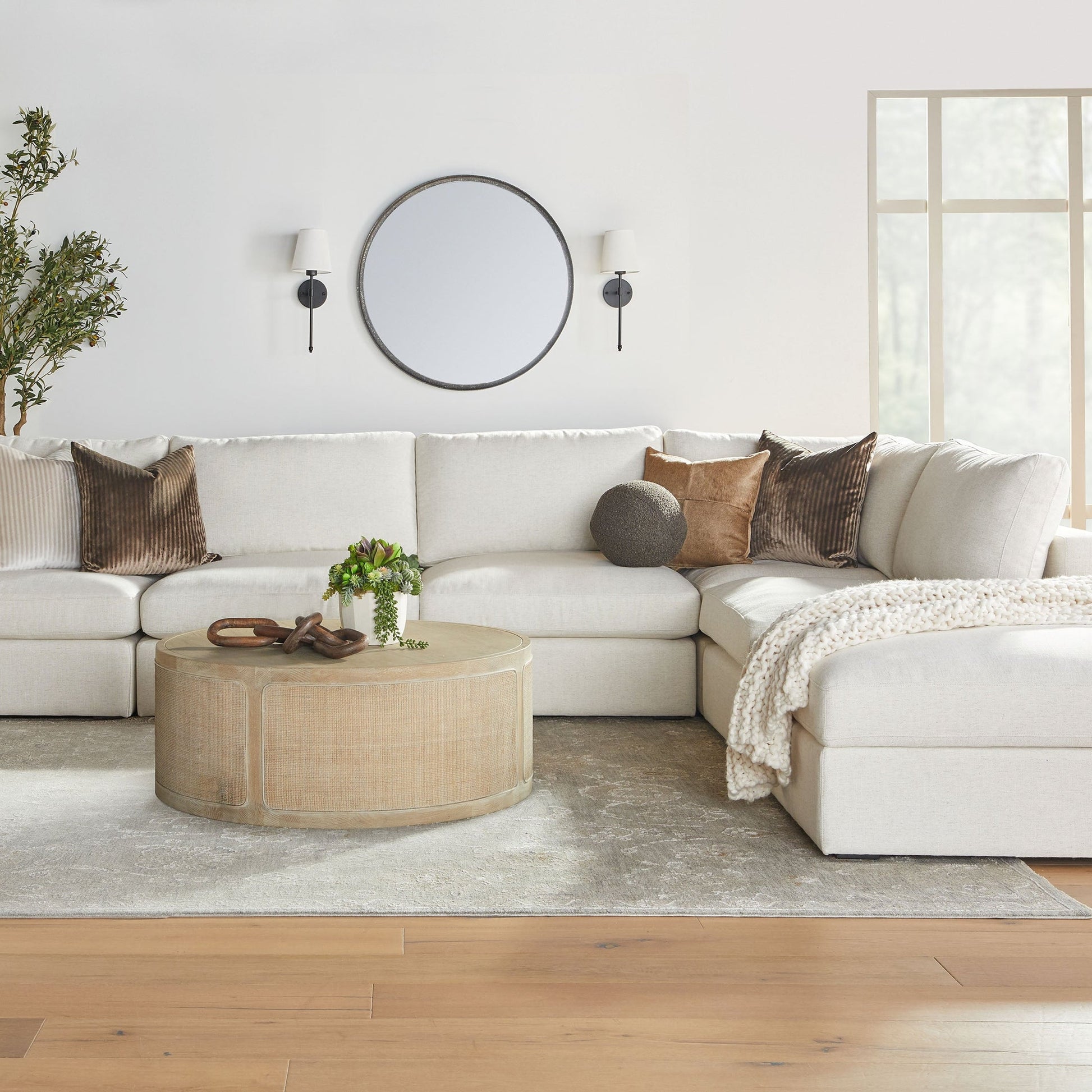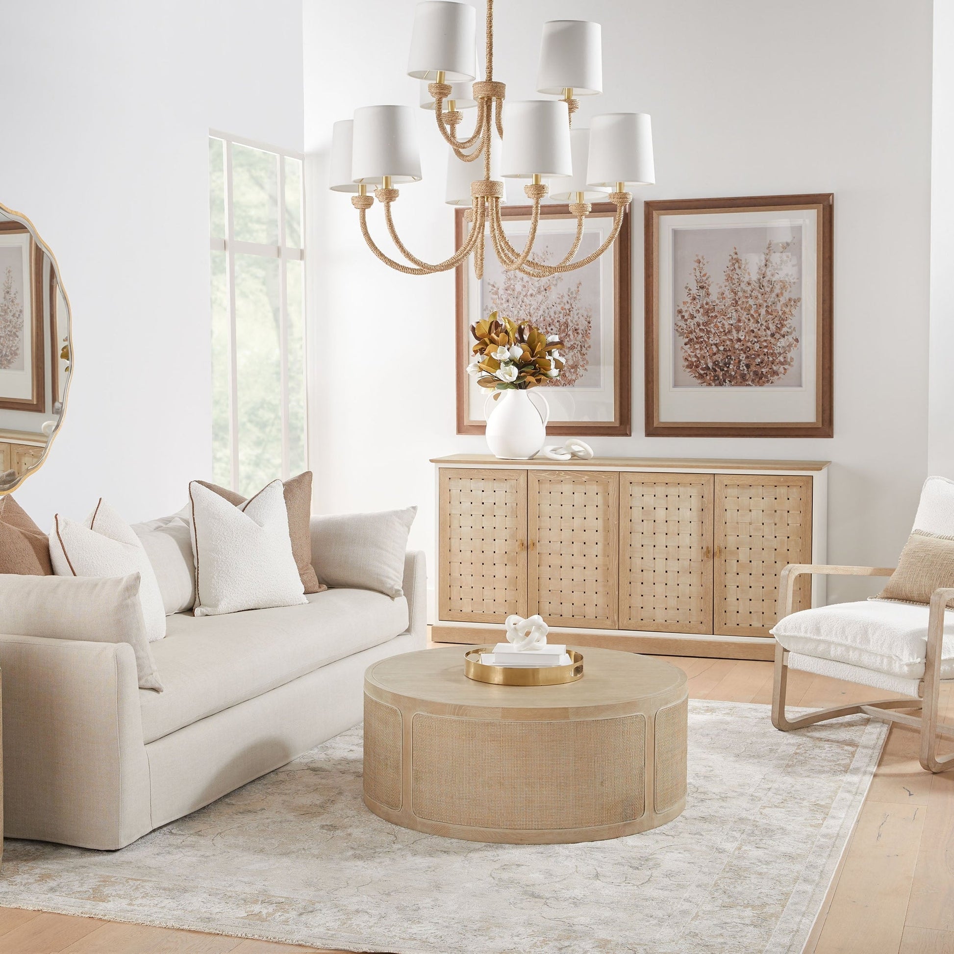 Mesurant 102 cm de diamètre et 40 cm de hauteur, cette table est dotée d'un intérieur creux qui lui confère une légèreté trompeuse tout en conservant son allure audacieuse. Son piètement ouvert et ses matériaux naturels lui confèrent un style épuré et naturel, parfait pour les intérieurs transitionnels, bohèmes ou d'inspiration côtière.