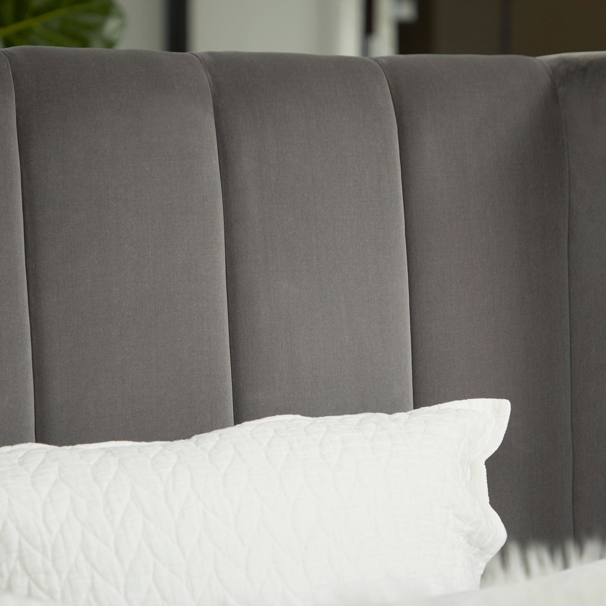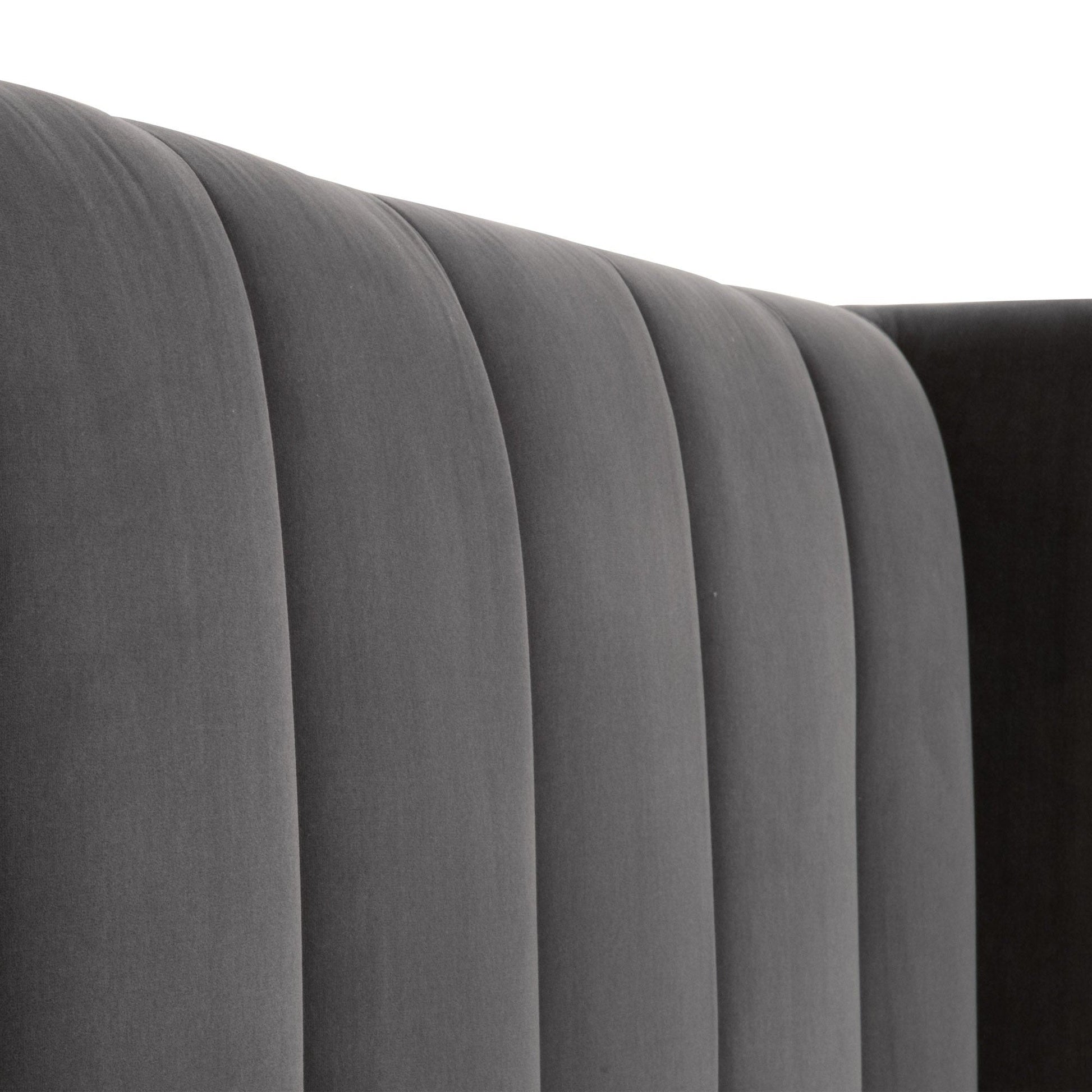 - Tête de lit sculptée à oreilles avec capitonnage à canaux verticaux et détails passepoilés