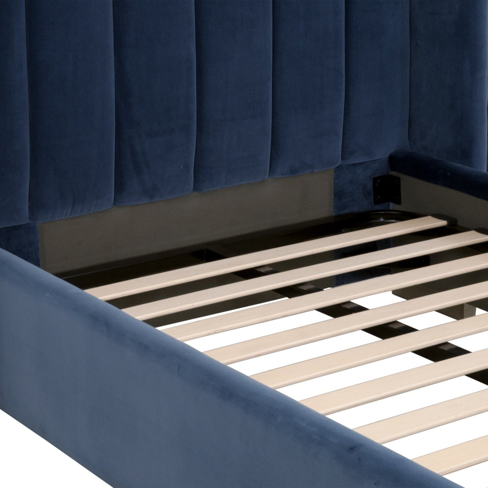 La tête de lit moelleuse à oreilles est ornée de surpiqûres verticales et de passepoils pour une silhouette architecturale raffinée. Revêtu d'un doux velours de coton mélangé, ce lit apporte confort et raffinement à votre intérieur. Un système de lattes métalliques amovibles de style européen assure stabilité et flexibilité, permettant la compatibilité avec un sommier tapissier si besoin.