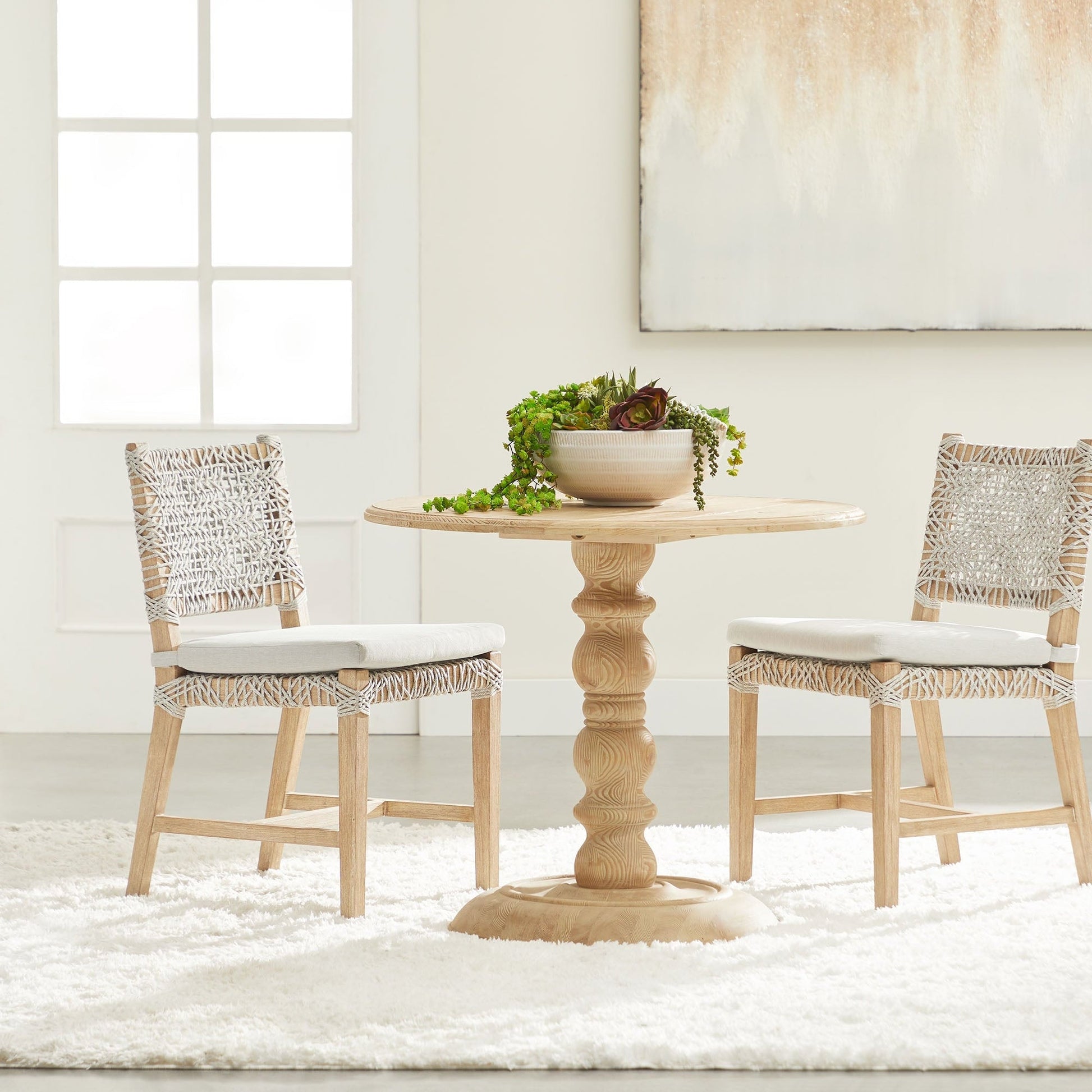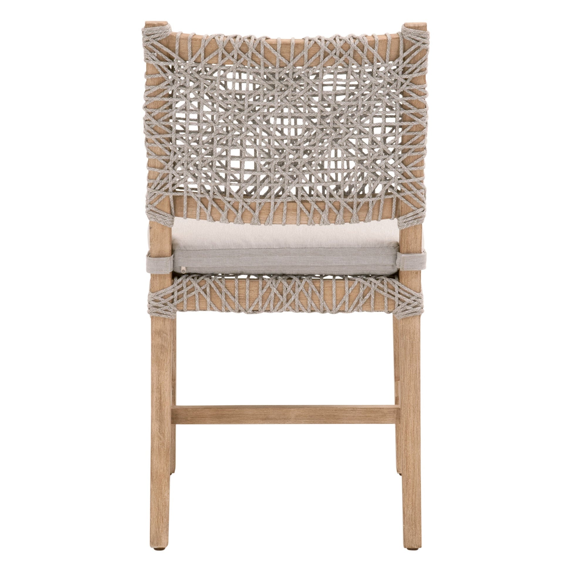 Mesurant 48 cm de large, 56 cm de profondeur et 87 cm de haut, avec une hauteur d'assise de 47 cm, cette chaise est dotée d'une assise et d'un dossier d'inspiration nautique, confectionnés en corde de polypropylène blanc et taupe à tissage serré. Un coussin amovible recouvert de tissu oléfine ponce assure un confort optimal et un entretien facile.