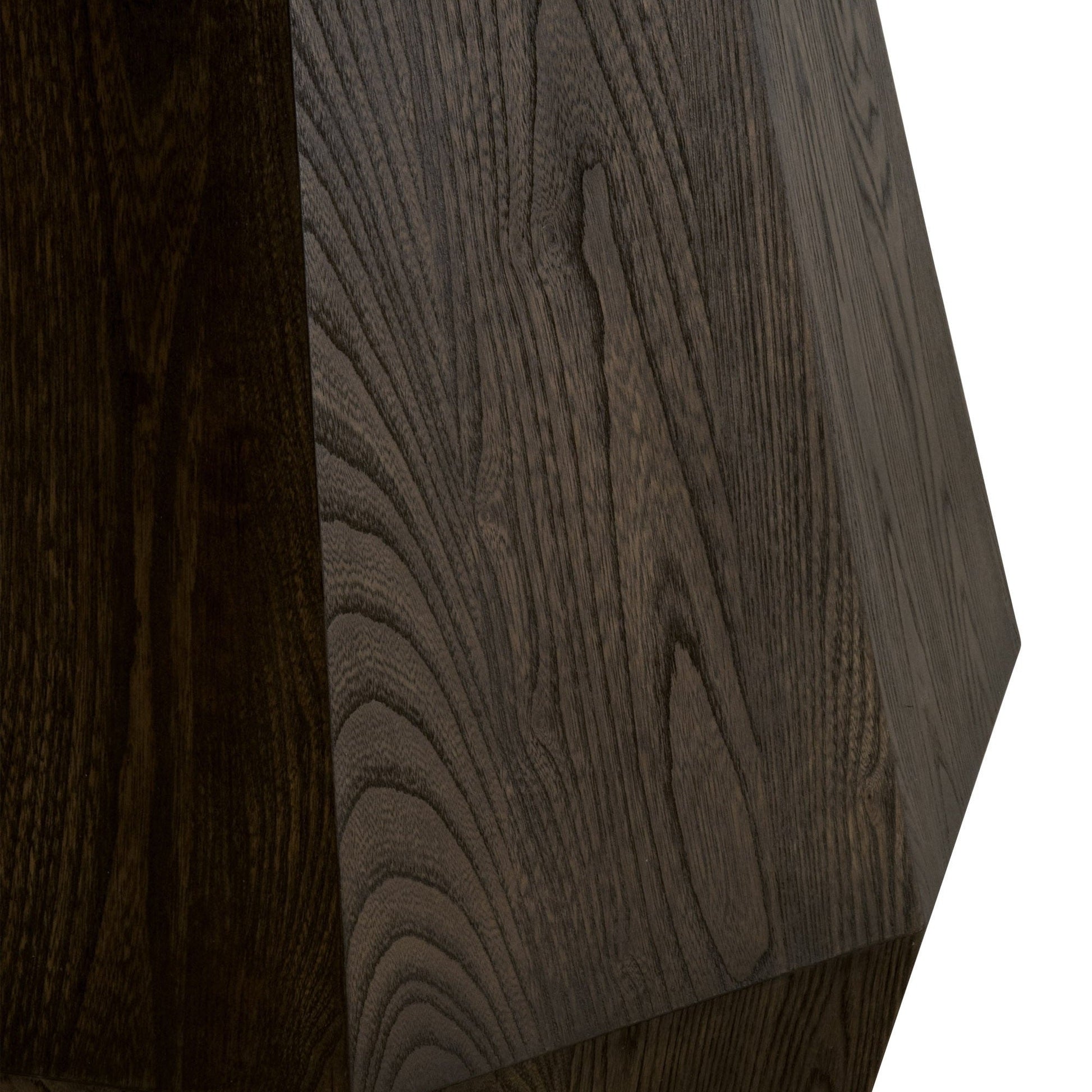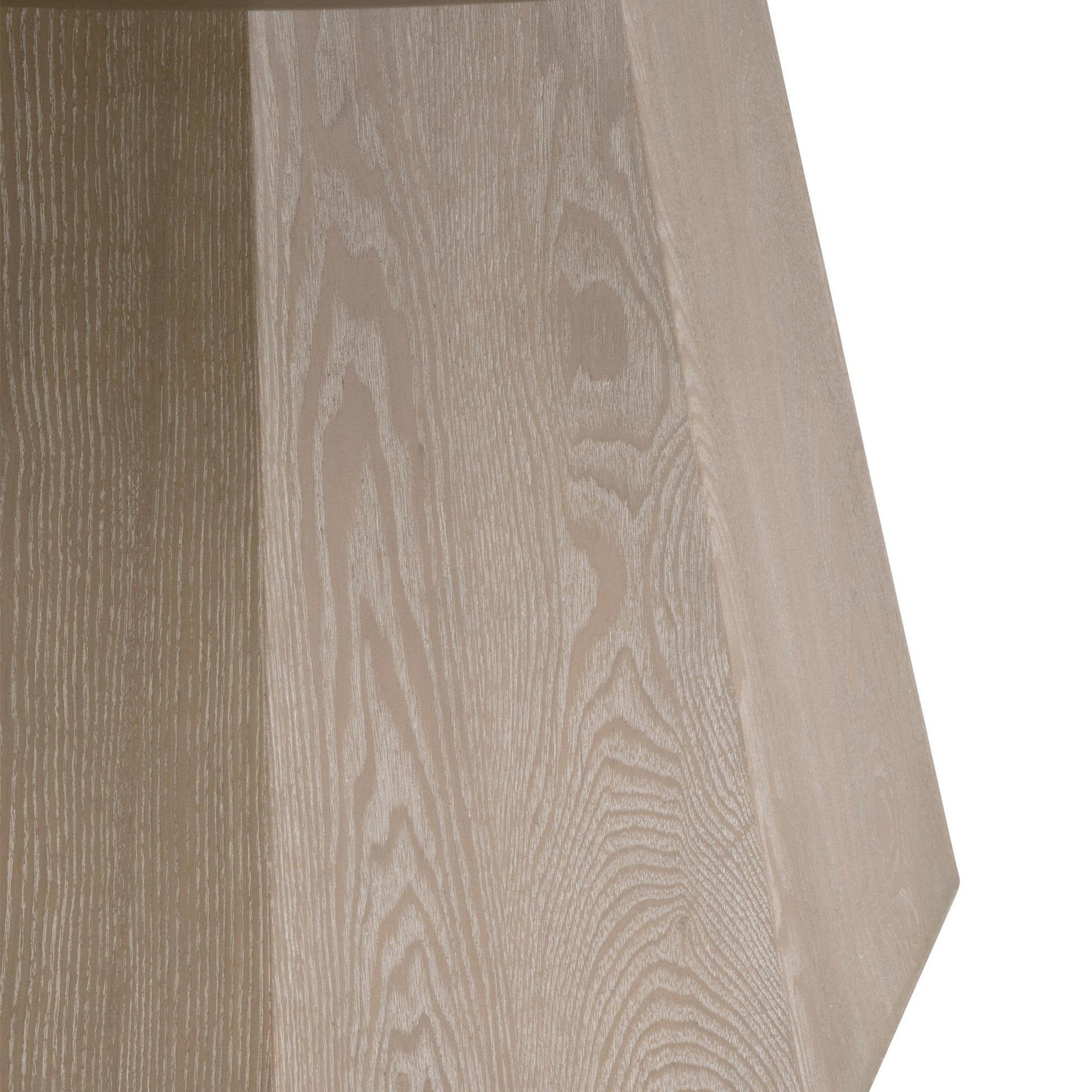 La table présente un piétement octogonal distinctif, effilé en haut et en bas, mettant en valeur le veinage naturel du bois et les lignes angulaires qui ajoutent profondeur et charme visuel. Le plateau présente un subtil motif étoilé, contrastant avec élégance et sobriété par rapport au design audacieux du piétement.