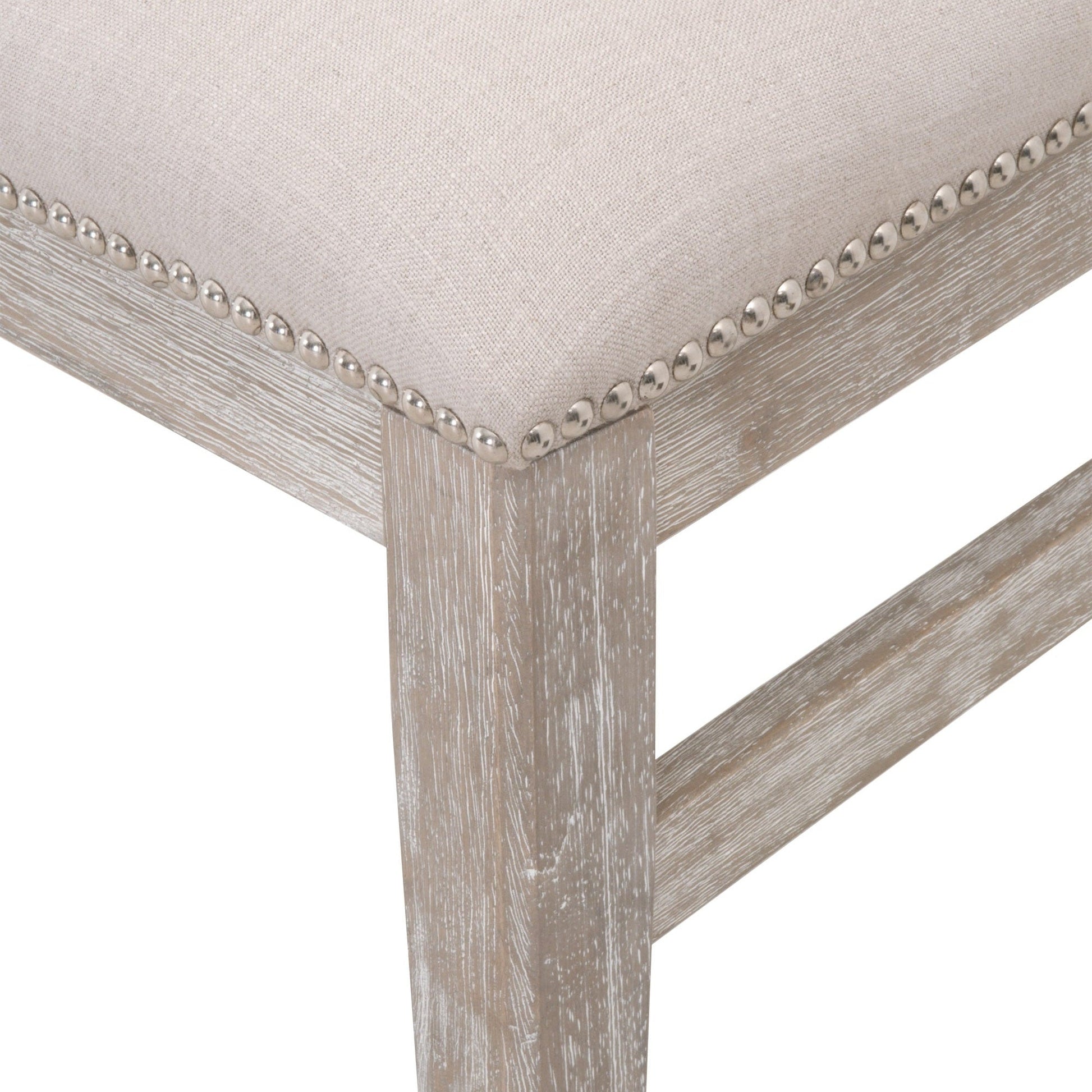 Revêtue d'un magnifique tissu en lin couleur pierre, l'assise et le dossier sont rehaussés d'élégants clous argentés, apportant une touche de sophistication subtile. Le dossier présente une structure en bois massif à la finition gris naturel qui s'harmonise parfaitement avec le revêtement en lin.