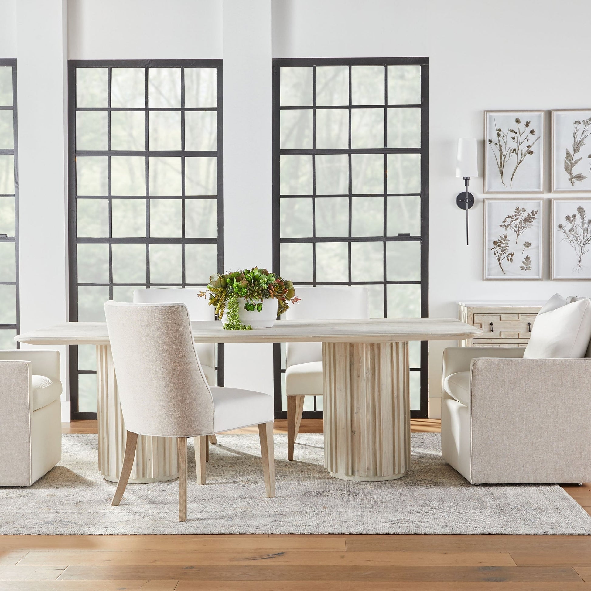L'assise et le dossier associent un tissu LiveSmart Peyton-Pearl blanc haute performance à l'avant et un lin français Performance Bisque résistant à l'arrière, offrant un équilibre parfait entre style, résistance et élégance intemporelle. Un passepoil contrasté sophistiqué apporte une touche raffinée, tandis que les pieds en bois massif assurent stabilité et durabilité.
