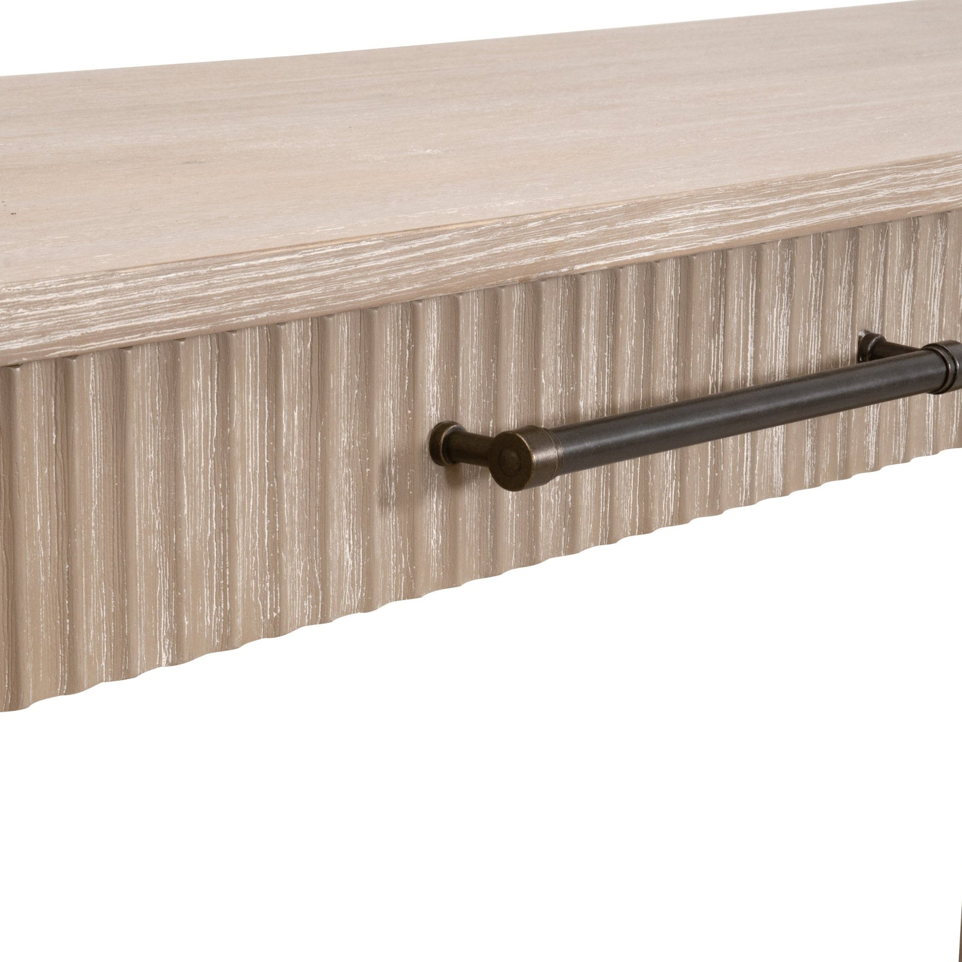 Les détails cannelés sur les façades des tiroirs apportent texture et profondeur, complétés par des poignées en bronze antique qui apportent une touche de charme vintage. Deux tiroirs généreux offrent un rangement pratique pour les objets du quotidien tout en conservant une silhouette épurée et épurée.