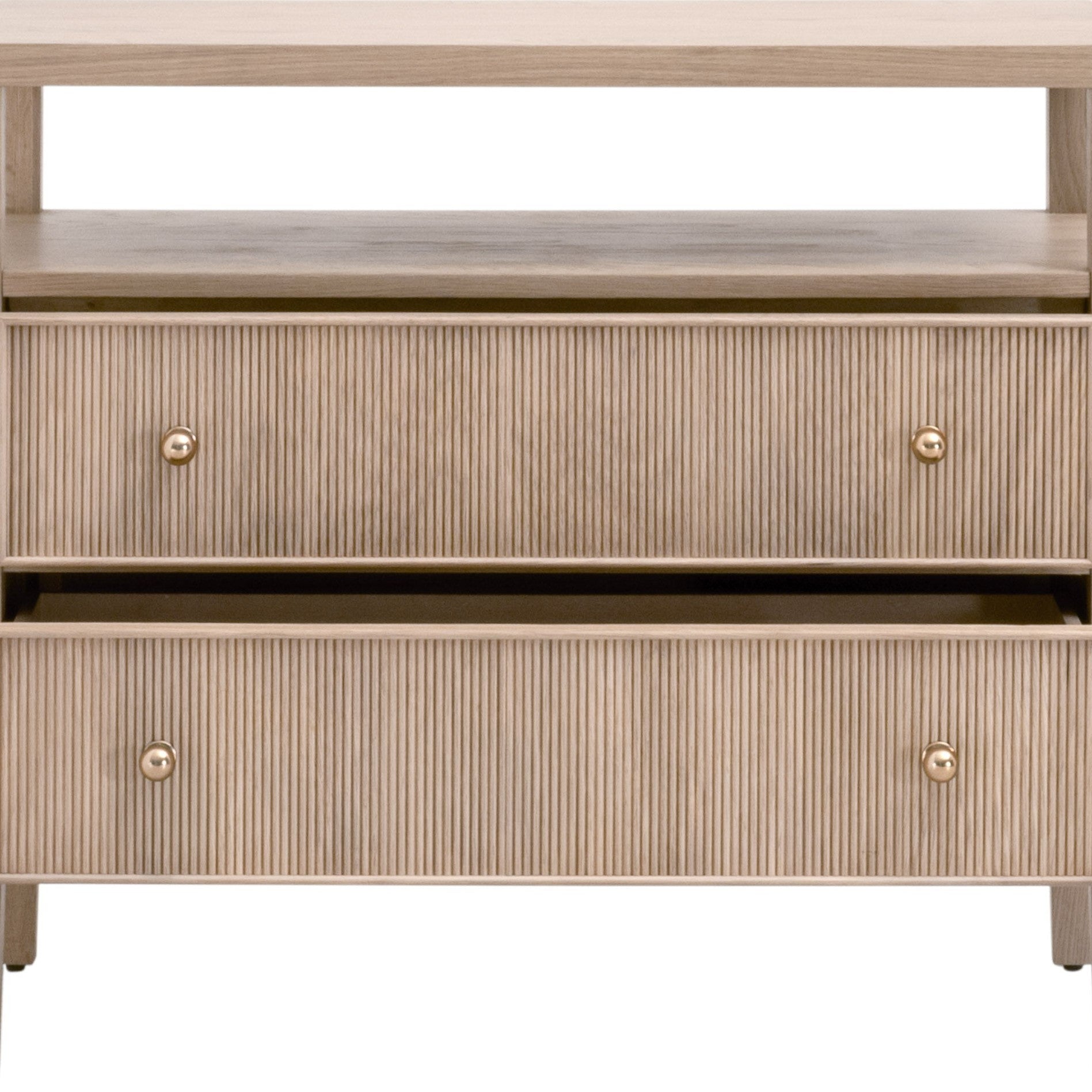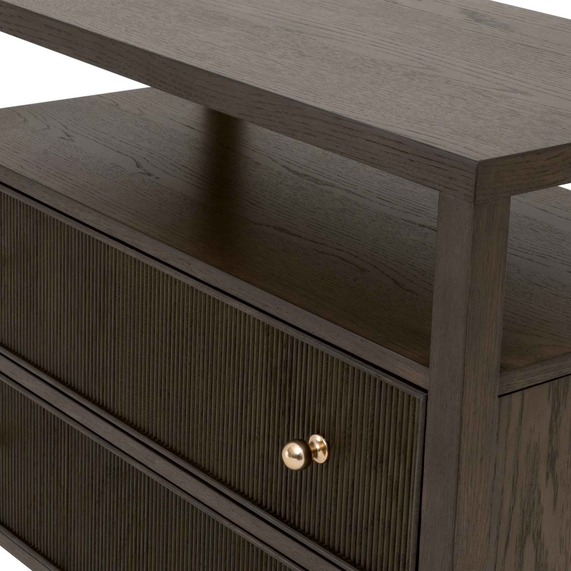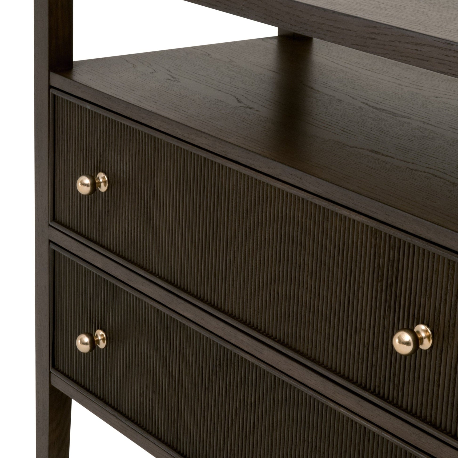 - Deux tiroirs à façade en bois cannelé avec boutons en laiton poli