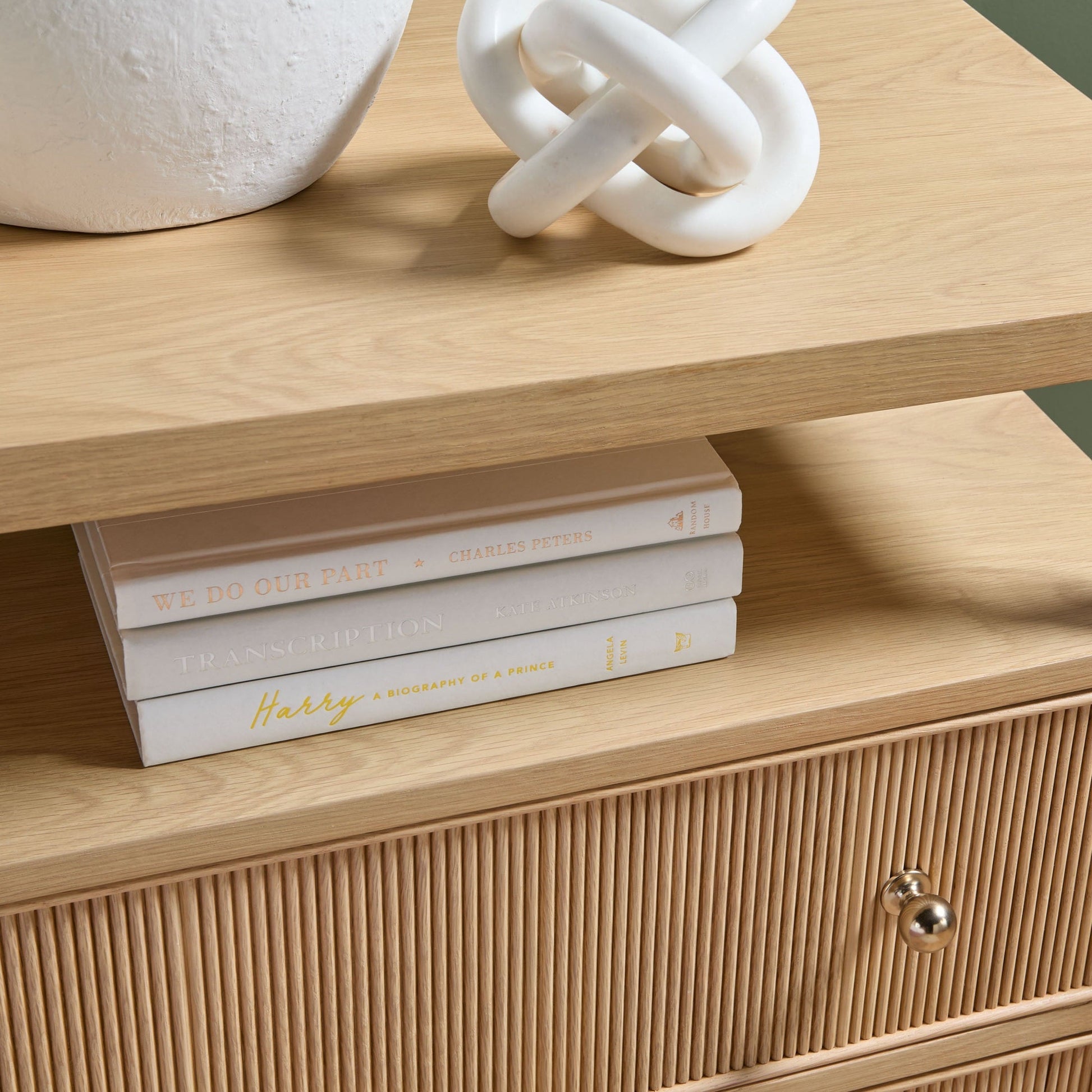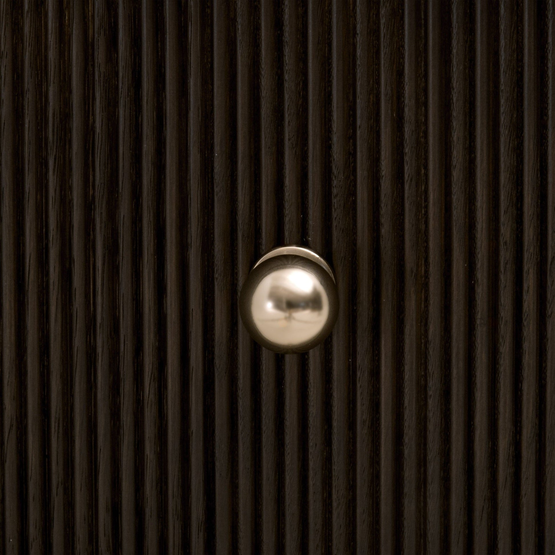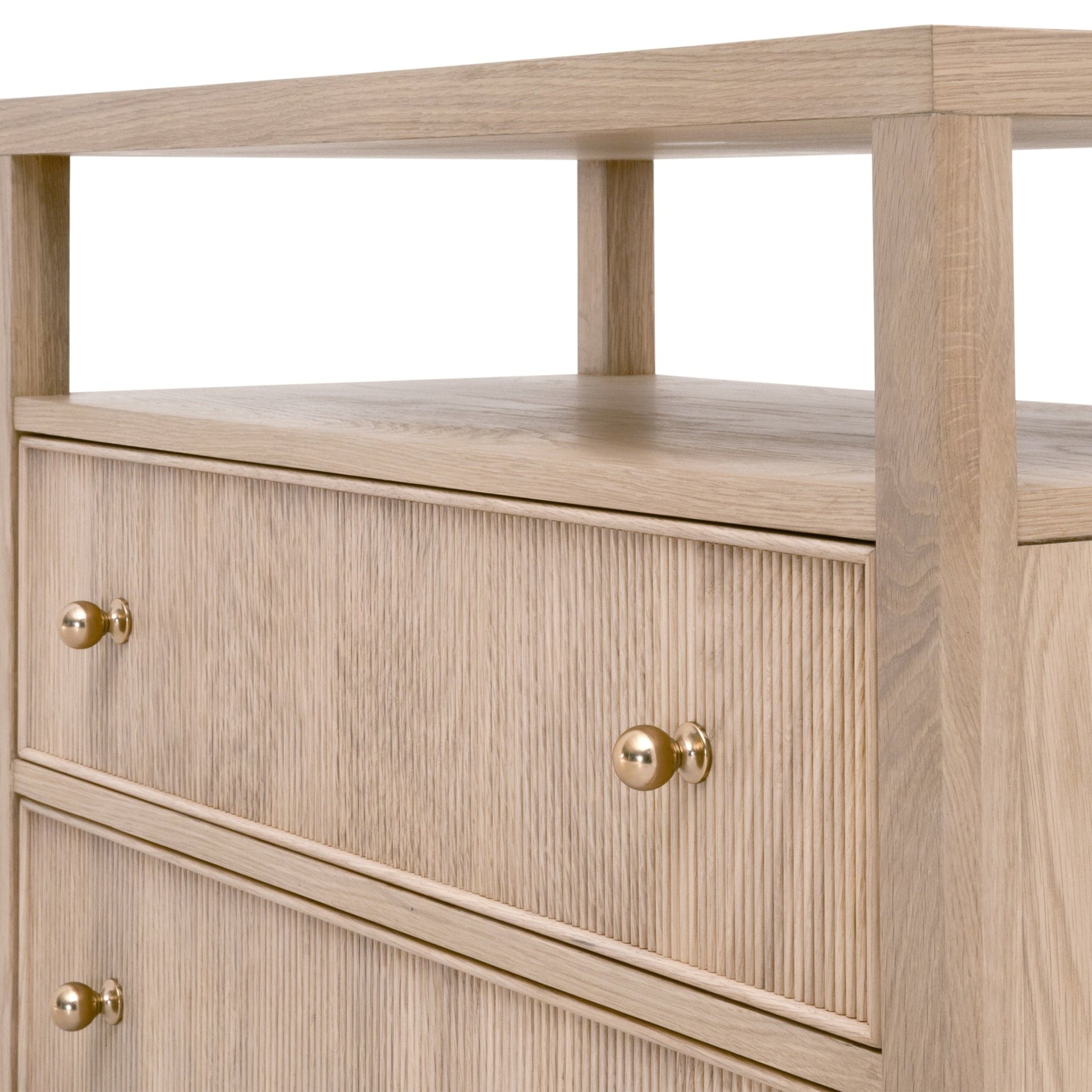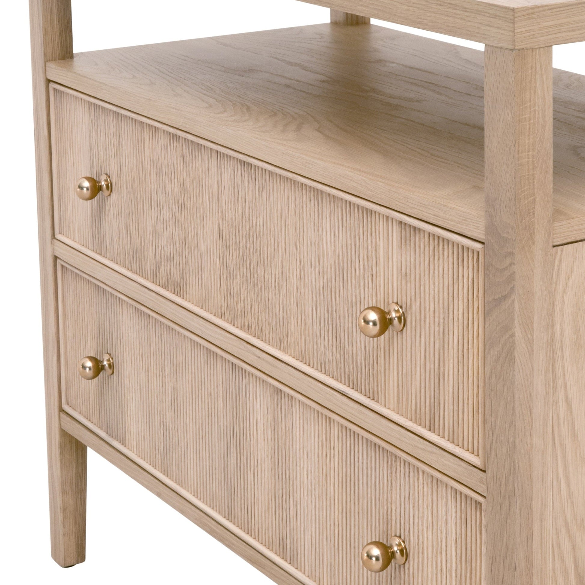 - Deux tiroirs à façade en bois cannelé avec boutons en laiton poli