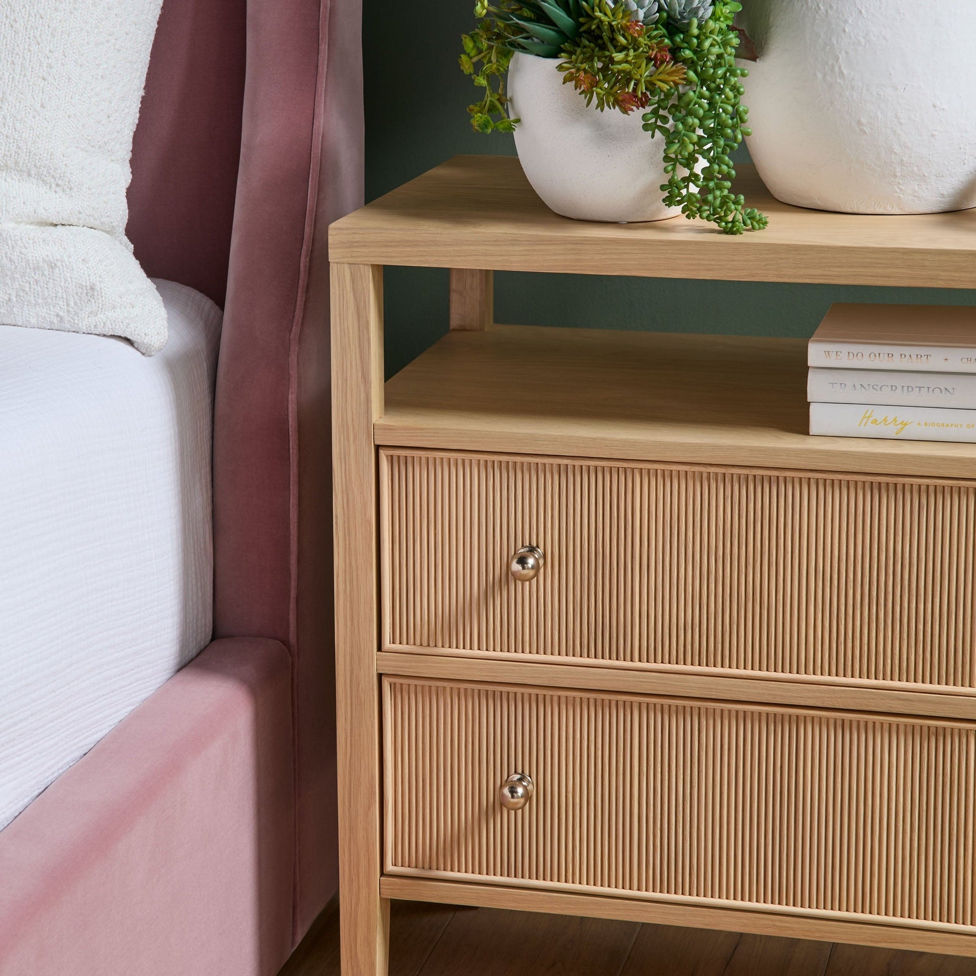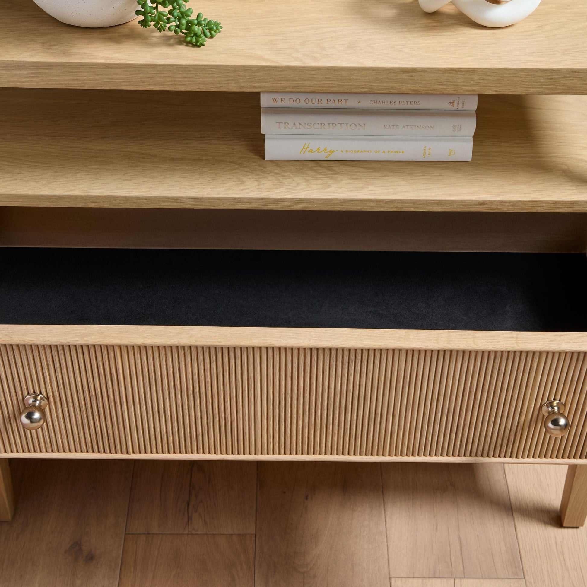 Mesurant 86 cm de large, 43 cm de profondeur et 76 cm de haut, cette large table de chevet offre un généreux espace de rangement. Ses deux tiroirs spacieux, dotés d'élégantes façades en bois cannelé et de boutons en laiton poli, allient charme classique et sophistication moderne. Ses doubles glissières métalliques assurent un fonctionnement fluide et sûr, tandis que le tiroir supérieur est doublé de feutre pour protéger vos objets fragiles.
