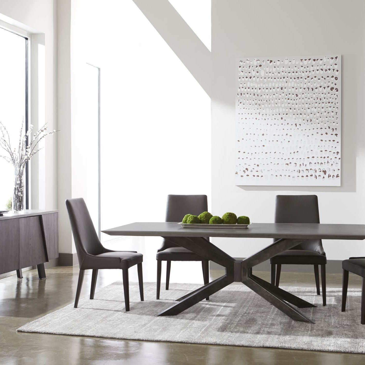 Mesurant 221 cm de large, 100 cm de profondeur et 76 cm de haut, cette table spacieuse peut accueillir confortablement jusqu'à huit convives. Son plateau rectangulaire aux bords inclinés constitue une pièce maîtresse audacieuse, idéale pour des repas et des réceptions mémorables. La surface en béton nano-scellé offre non seulement une esthétique élégante, mais résiste également à la plupart des taches, alliant durabilité et raffinement.