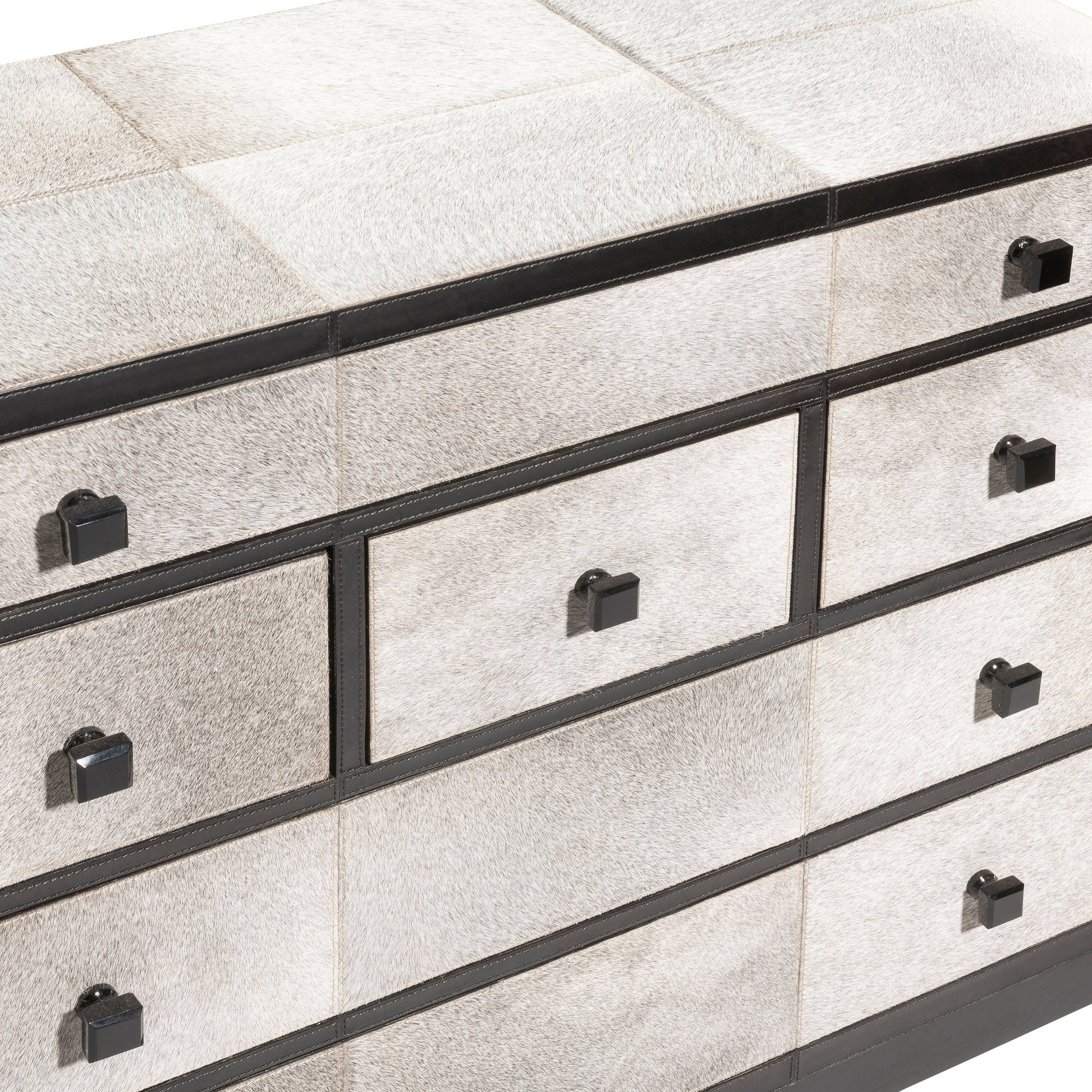 La commode Lola de GO HOME allie texture et élégance raffinée dans un design à la fois luxueux et artistiquement inattendu. Revêtue d'un doux cuir gris et ornée de surpiqûres sellier précises, elle est encadrée d'un élégant cuir noir pour un contraste saisissant. Les boutons en verre noir à facettes offrent un subtil éclat, ajoutant une touche de bijou à sa forme minimaliste.