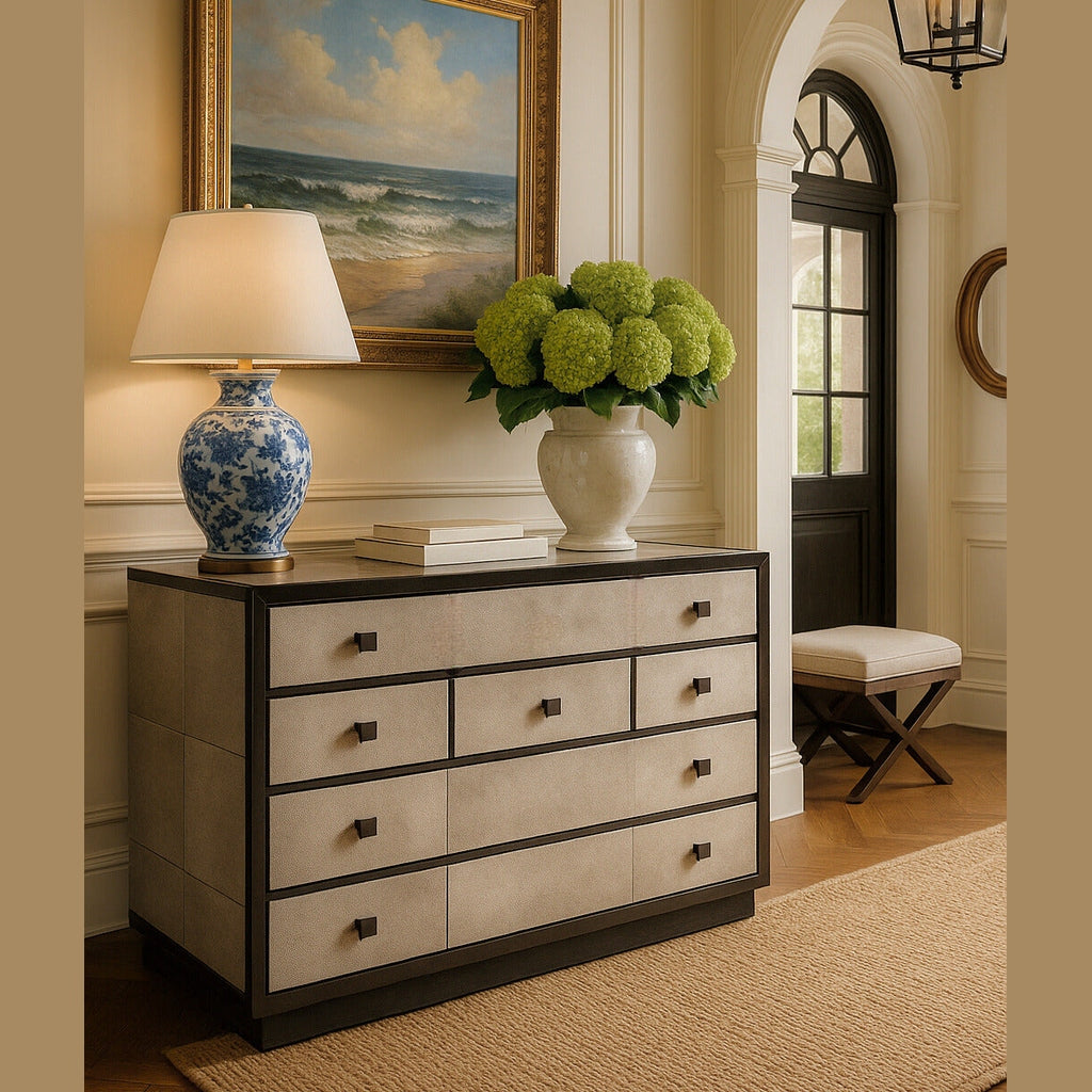Un ajout audacieux mais raffiné aux chambres, aux dressings ou aux entrées, la commode Lola rehausse n'importe quel espace avec ses matériaux distinctifs et sa silhouette sophistiquée.