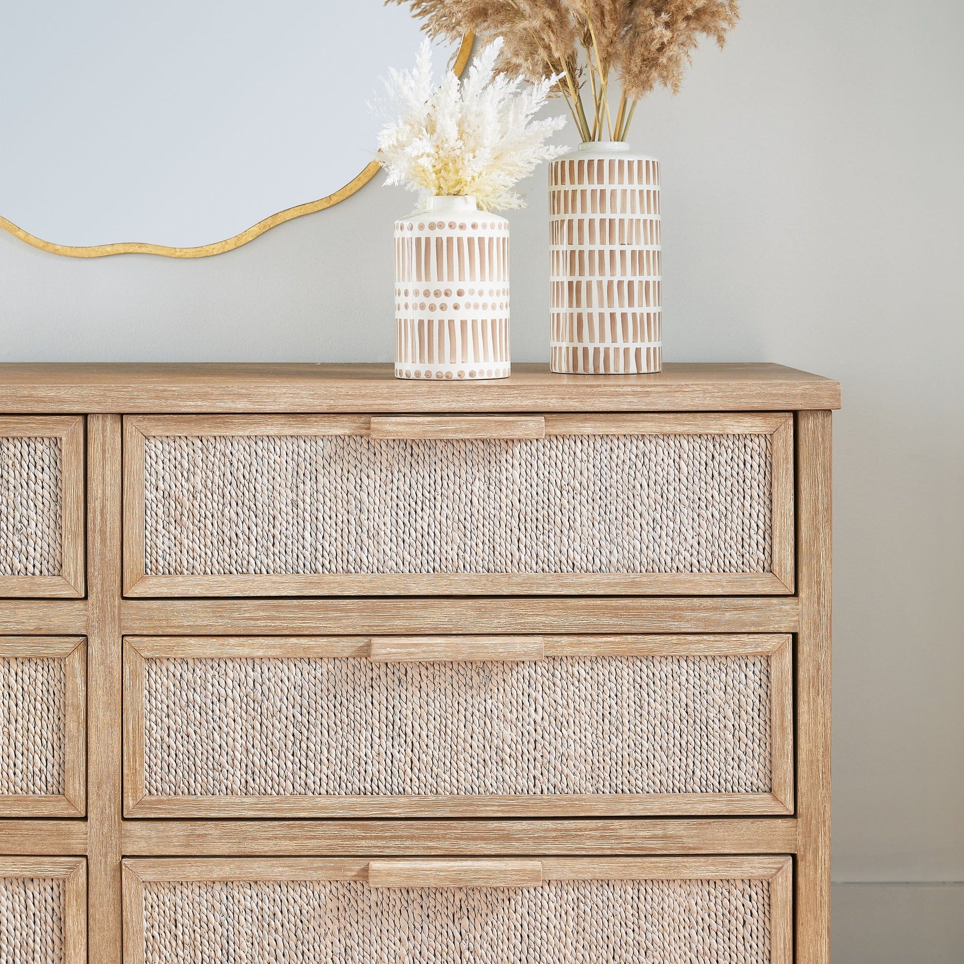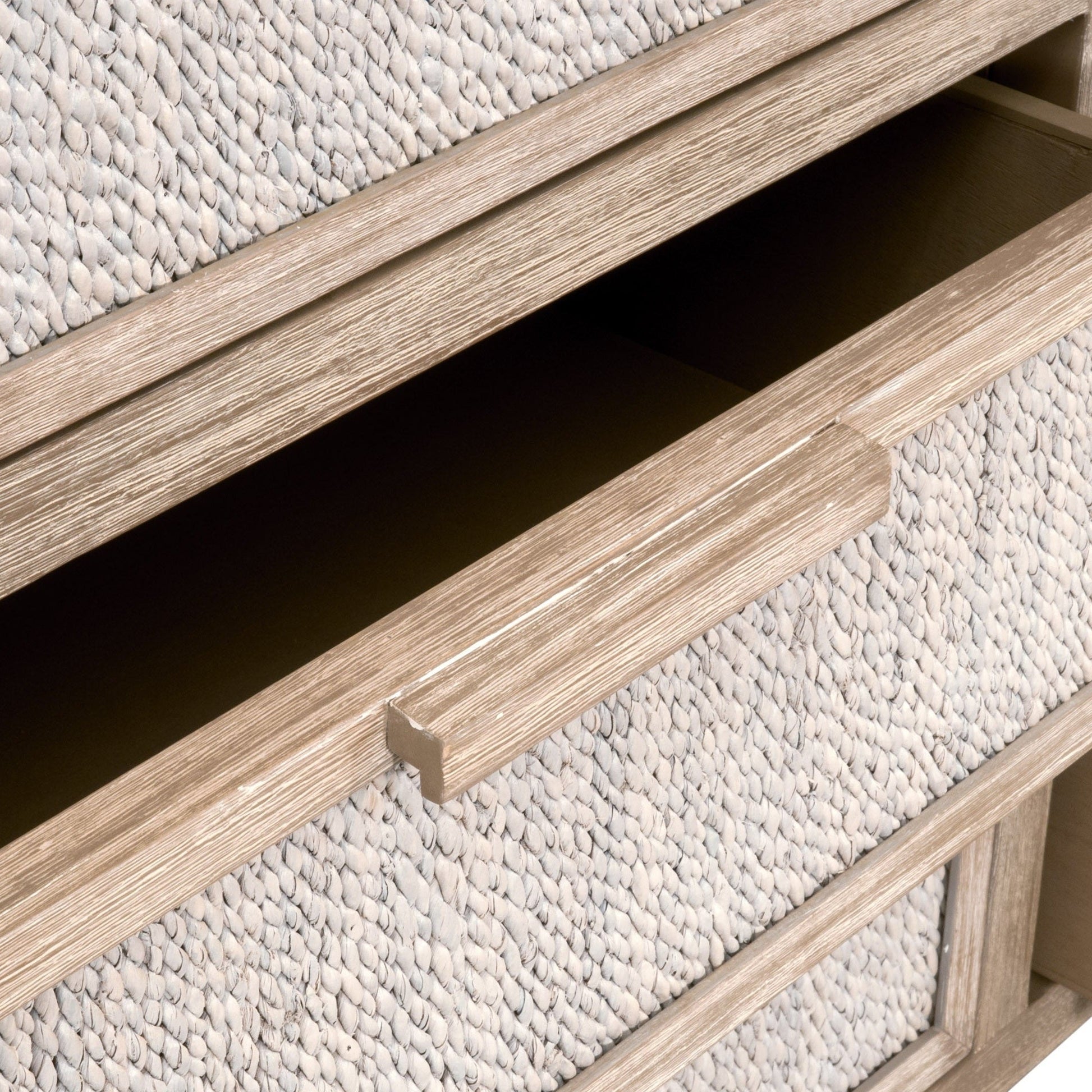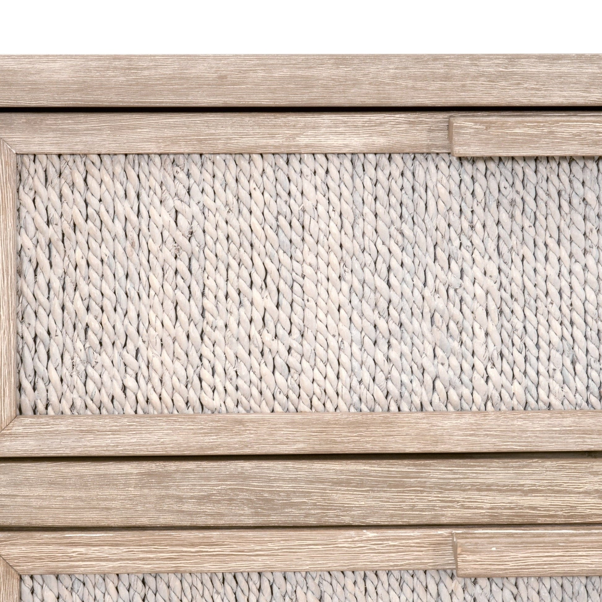 Fabriquée avec un cadre en acajou massif à la douce finition gris naturel, la commode est enveloppée de corde d'abaca blanchie à la chaux tressée à la main , offrant une texture organique et une profondeur visuelle. Six tiroirs spacieux coulissent en douceur sur des glissières en bois avec butées intégrées , offrant un espace de rangement sûr et généreux pour les vêtements, la literie ou les accessoires.