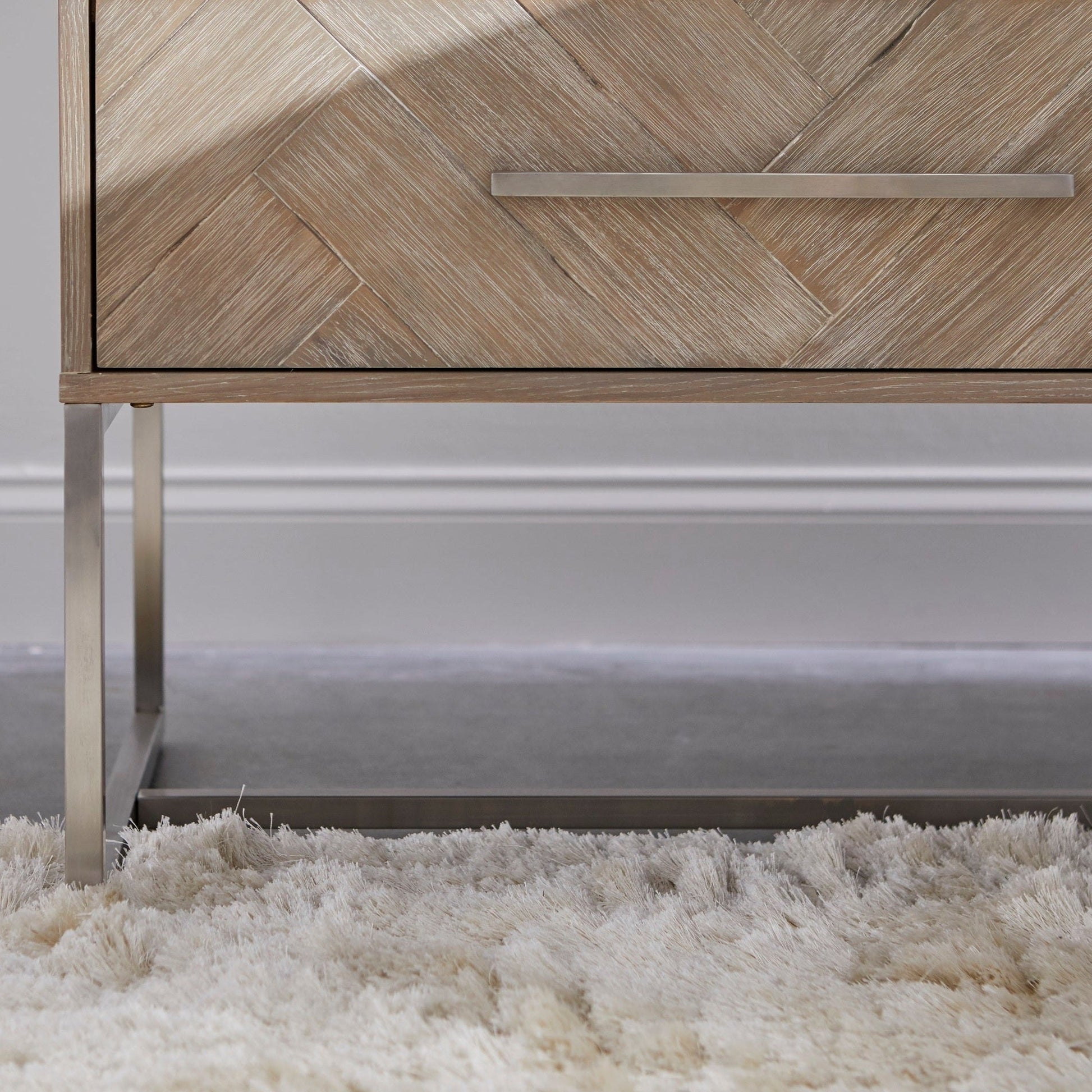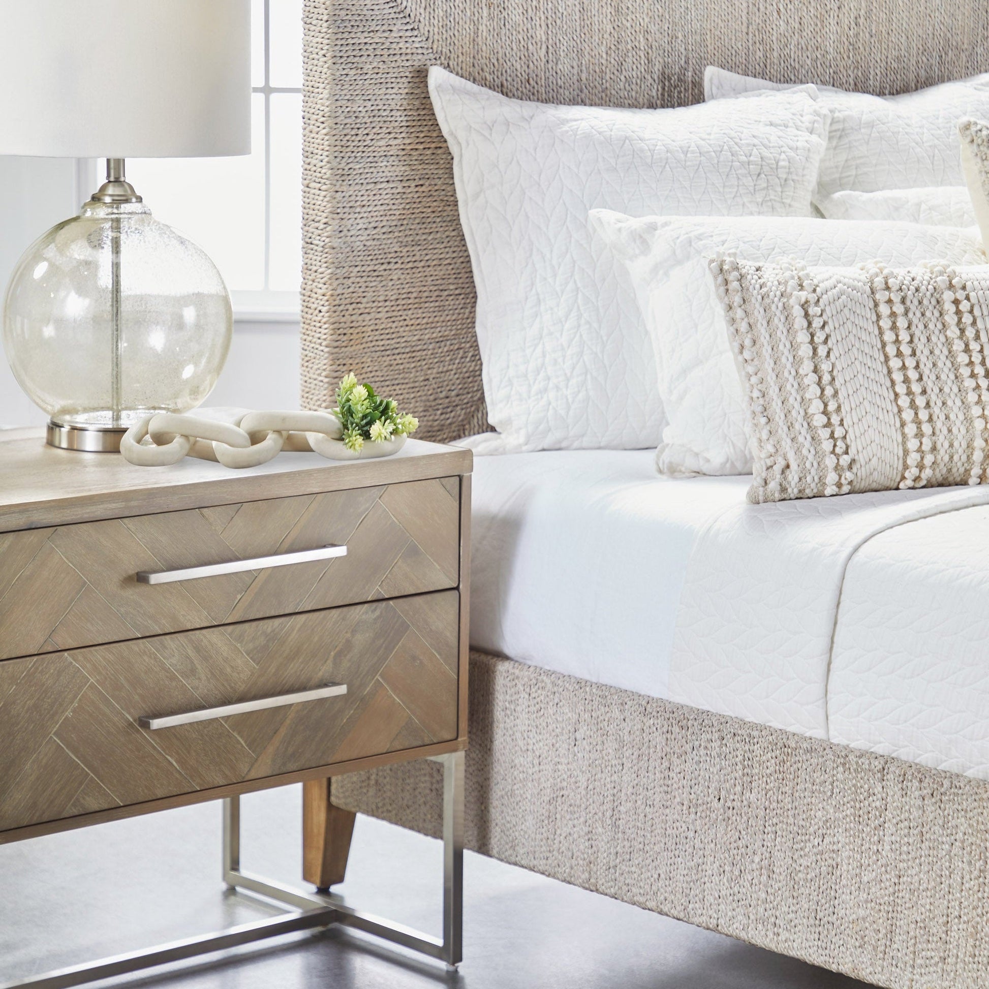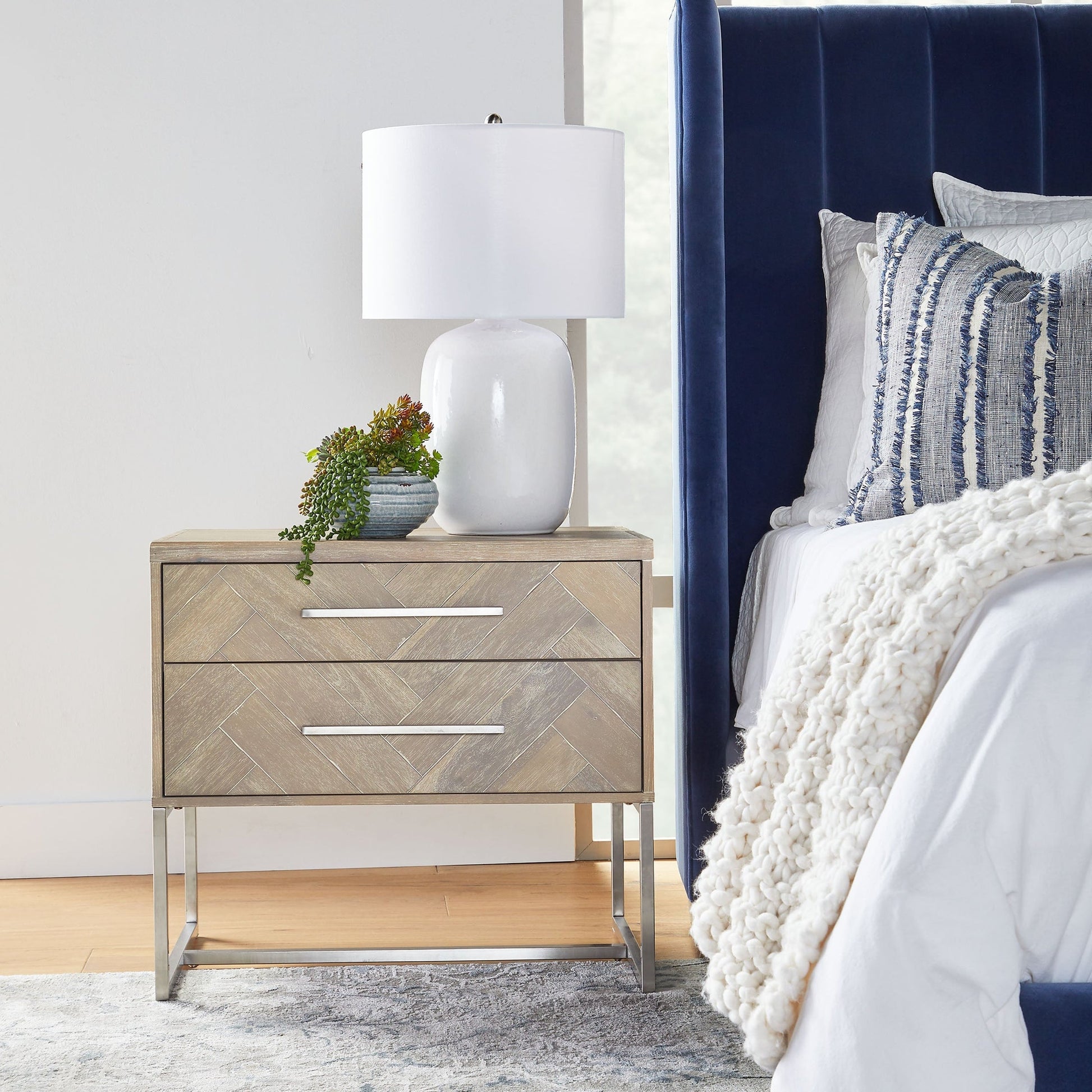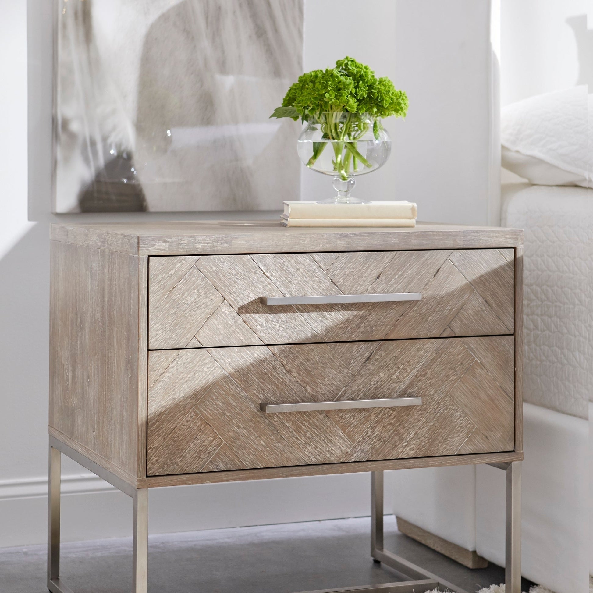 Apportez une touche d'audace et d'élégance raffinée à votre chambre avec la table de chevet Mosaic à 2 tiroirs d'Essentials For Living. Conçue pour les intérieurs transitionnels et modernes, cette table de chevet arbore des façades en placage d'acacia à chevrons qui mettent en valeur le grain naturel et les variations du bois. Son élégant piètement et ses poignées en acier inoxydable brossé offrent un contraste contemporain, pour une finition épurée et sophistiquée.