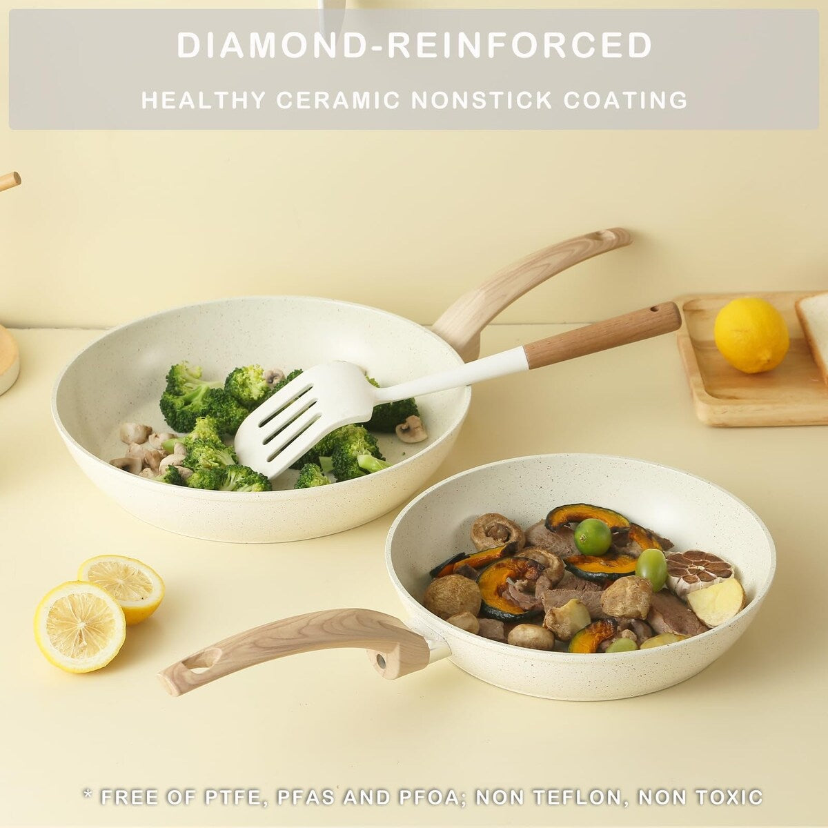 Revêtement antiadhésif en céramique écologique — Produits certifiés SGS et TUV, 100 % sans PFOS ni PFOA. Nos ustensiles de cuisine vous garantissent une cuisine quotidienne plus sûre et plus saine. Intérieur sans rivets pour éviter les accrocs et l'accumulation d'aliments. Une simple éponge douce ou un torchon suffit pour éliminer les taches d'huile. Évitez d'utiliser une brosse pointue ou tranchante, car cela pourrait endommager le revêtement antiadhésif.