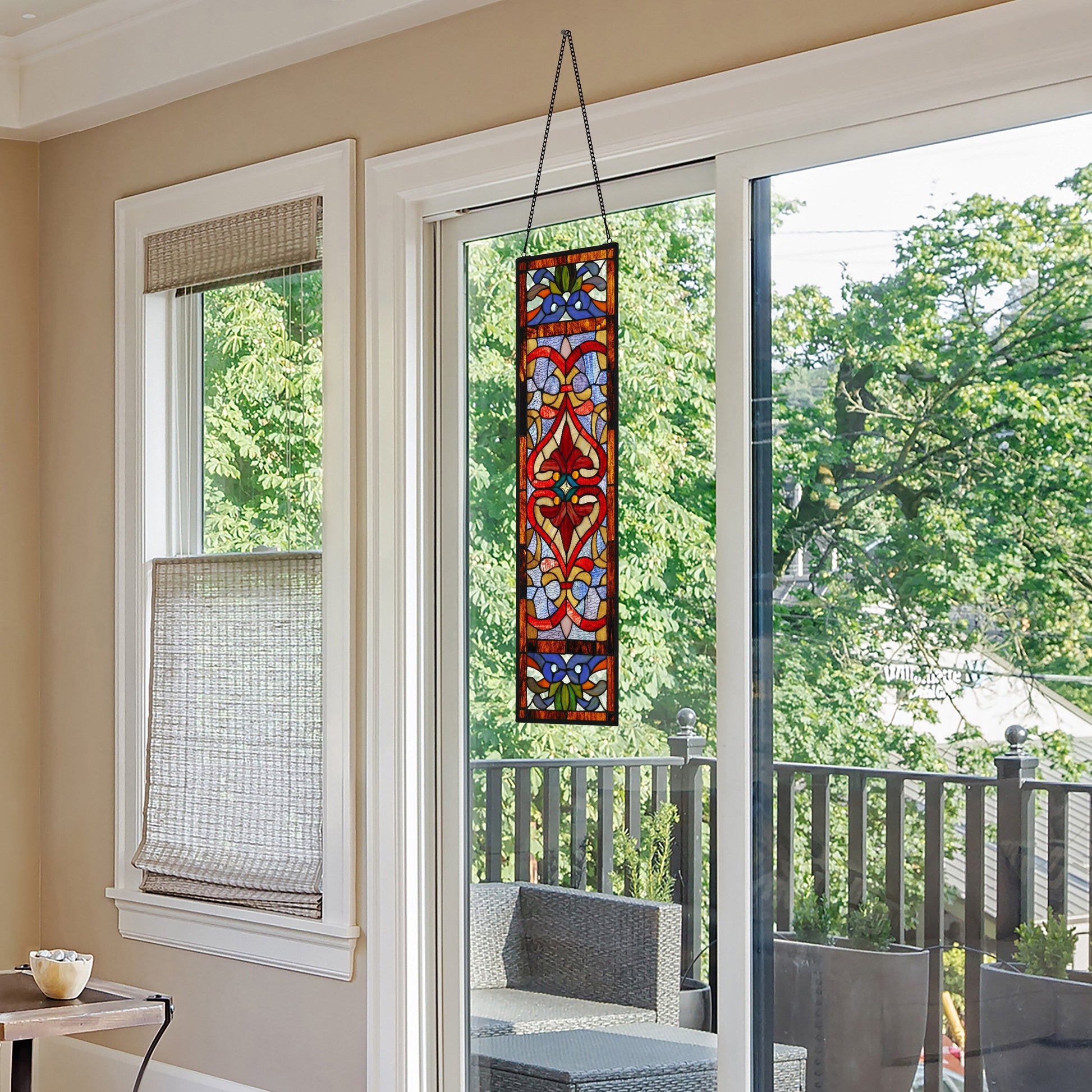 Ajoutez intimité et beauté à votre intérieur avec ce vitrail de style victorien signé River of Goods. Son exquis motif Fleur de Lys est réalisé à la main dans des tons bleu, bleu sarcelle et rouge éclatants qui captent les rayons du soleil et reflètent la lumière dans toutes les pièces. Ce panneau est livré avec une chaîne décorative pour une installation facile et peut être exposé comme attrape-soleil, suspendu au mur ou à côté de votre porte d'entrée. Faites plaisir à vos proches avec ce magnifique vitrail qui apportera chaleur et gaieté à tout espace de vie.