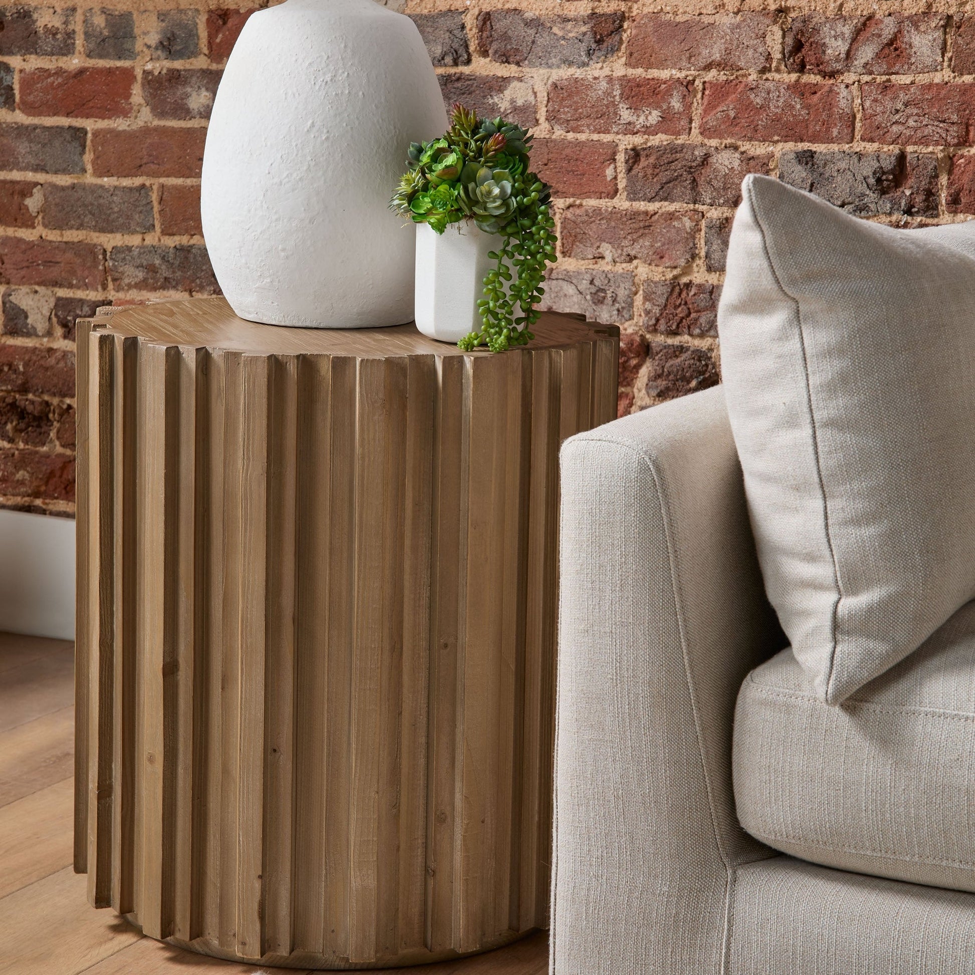 - La forme ronde avec des cannelures décoratives en bois ajoute un intérêt architectural