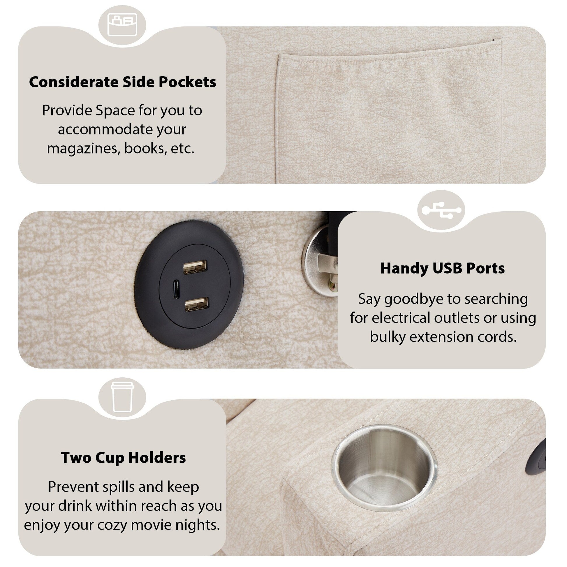 - Fonctionnalités pratiques : comprend 3 ports USB pour un chargement facile, 2 poches latérales pour le rangement et 2 porte-gobelets intégrés pour garder les boissons à portée de main sans déversement.