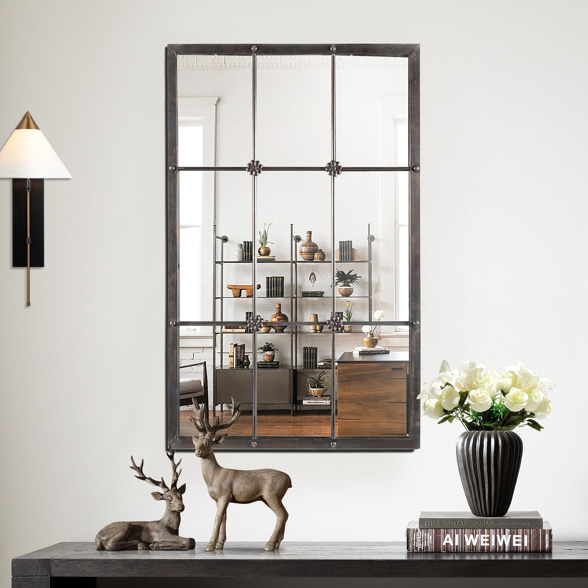 Marre des murs ennuyeux ? Ce miroir mural classique à carreaux apportera instantanément de la lumière à votre intérieur et créera une illusion d'espace. Ce miroir rectangulaire est composé d'un seul morceau de miroir derrière neuf sections de carreaux et est livré prêt à être accroché avec la quincaillerie incluse. Il est prêt à être fixé sur toute surface plane grâce aux languettes métalliques fixées au dos du cadre. Il peut être suspendu horizontalement ou verticalement, selon vos envies. Le cadre est en métal et le miroir est divisé en sections pour imiter une fenêtre. Illuminez votre intérieur avec ce magnifique miroir mural à carreaux. Le miroir est doté d'un cadre en métal à la finition marron rustique. Les carreaux sont ornés d'une fleur en métal au centre. Ce miroir mural sera un point de mire idéal pour votre entrée, votre salon, votre couloir ou votre chambre.
