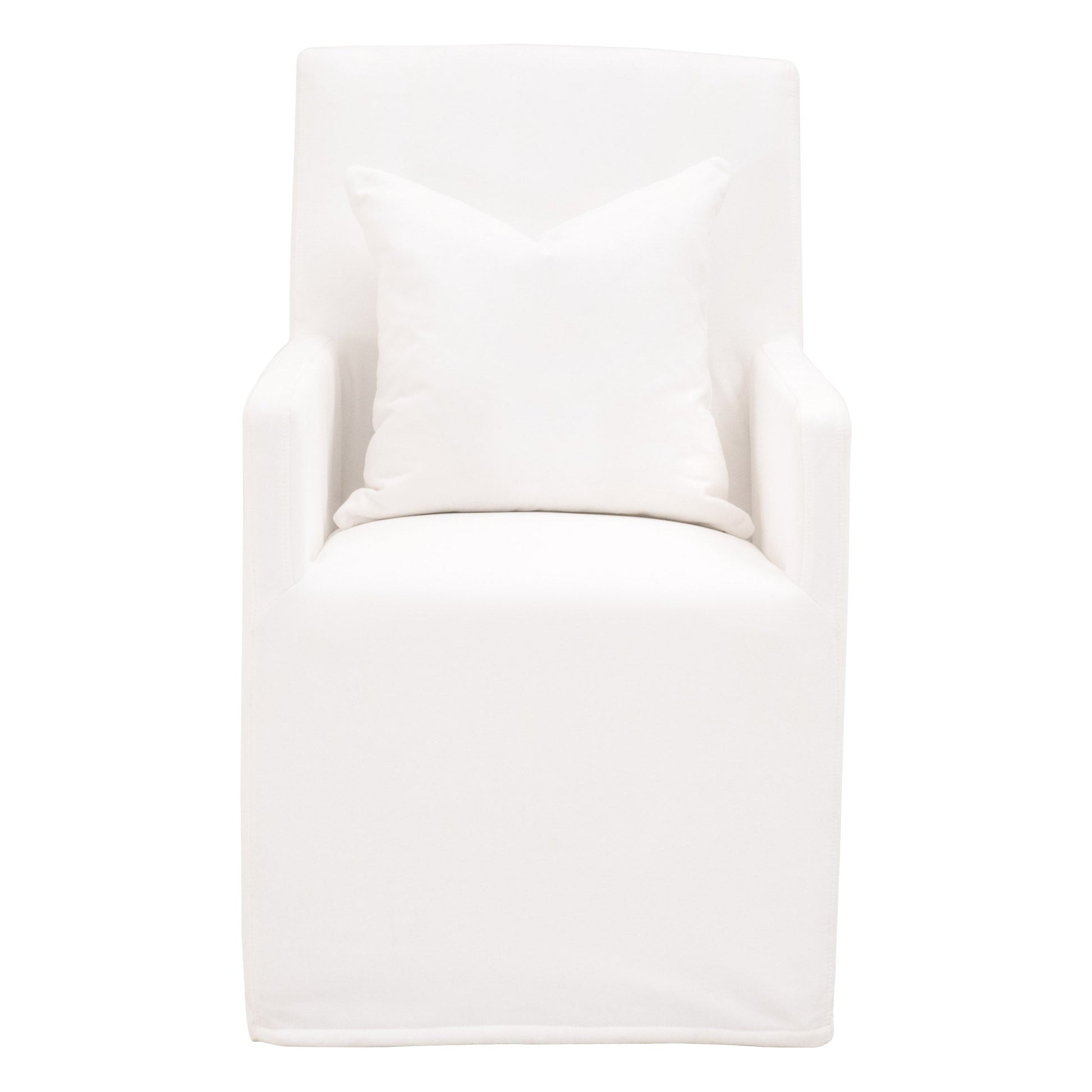 La housse amovible sur mesure est dotée d'une jupe complète dissimulant les roulettes à roulement fluide , offrant une mobilité discrète sans compromettre le style. Son assise rembourrée, son coussin lombaire en duvet inclus et ses accoudoirs légèrement évasés offrent un confort optimal lors des longs repas ou réunions.