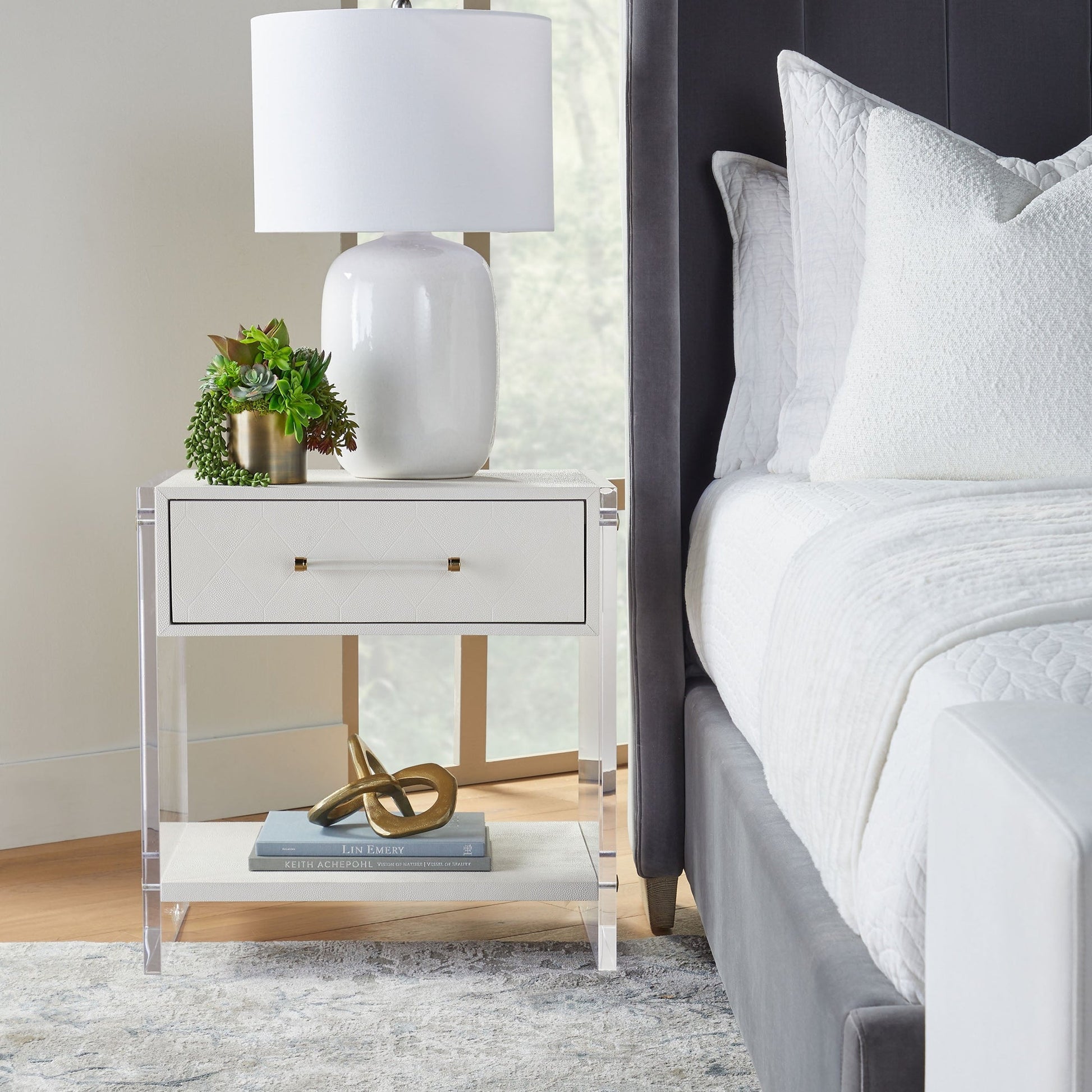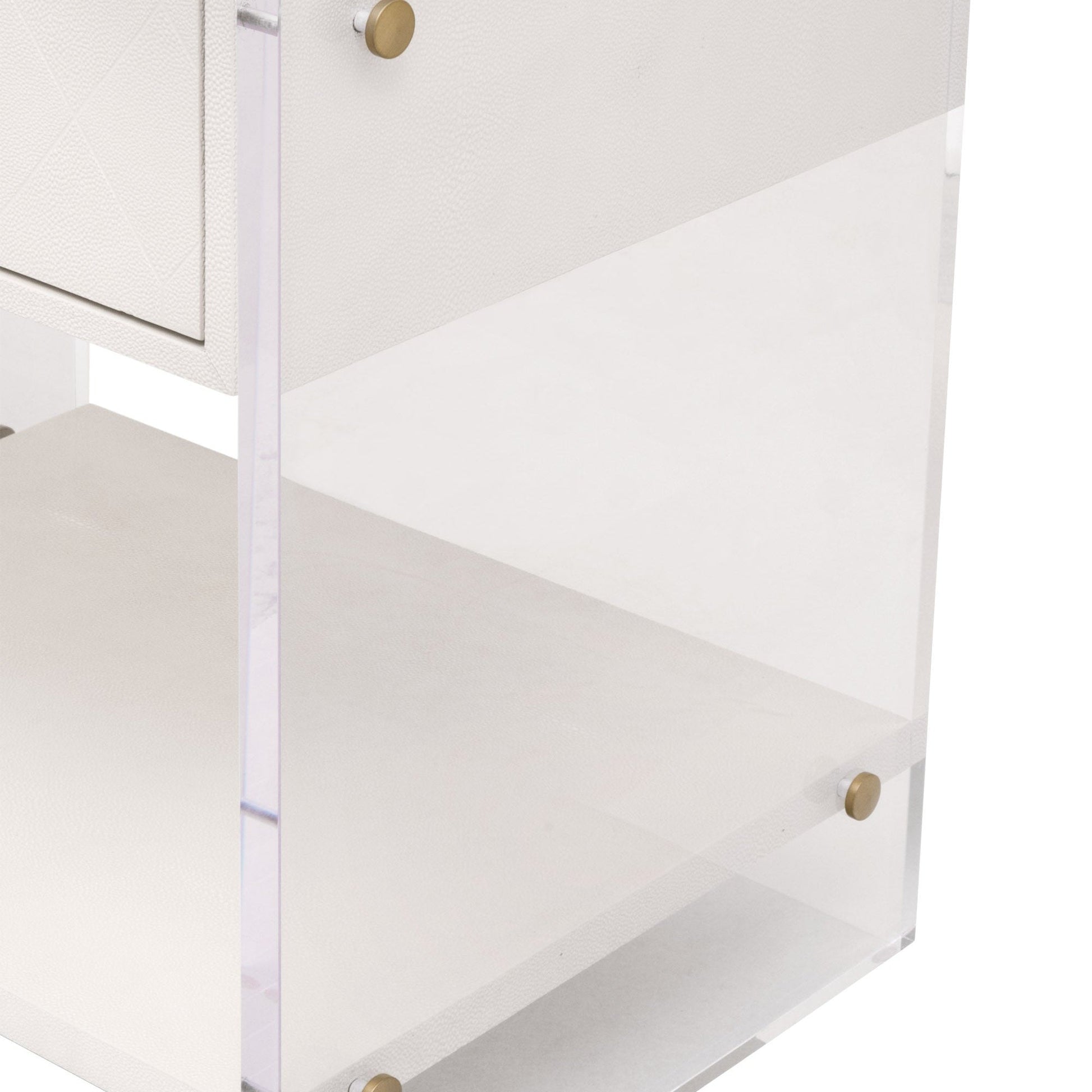 La façade du tiroir en faux galuchat présente un doux motif géométrique en losanges, offrant texture et attrait visuel. Les côtés et les pieds en acrylique transparent confèrent une sensation de légèreté et de légèreté, tandis que les touches de laiton brossé sur la poignée et les supports latéraux du tiroir apportent chaleur et sophistication. Un tiroir coulissant offre un rangement pratique au chevet, et l' étagère inférieure ouverte permet de ranger livres, paniers ou objets décoratifs.