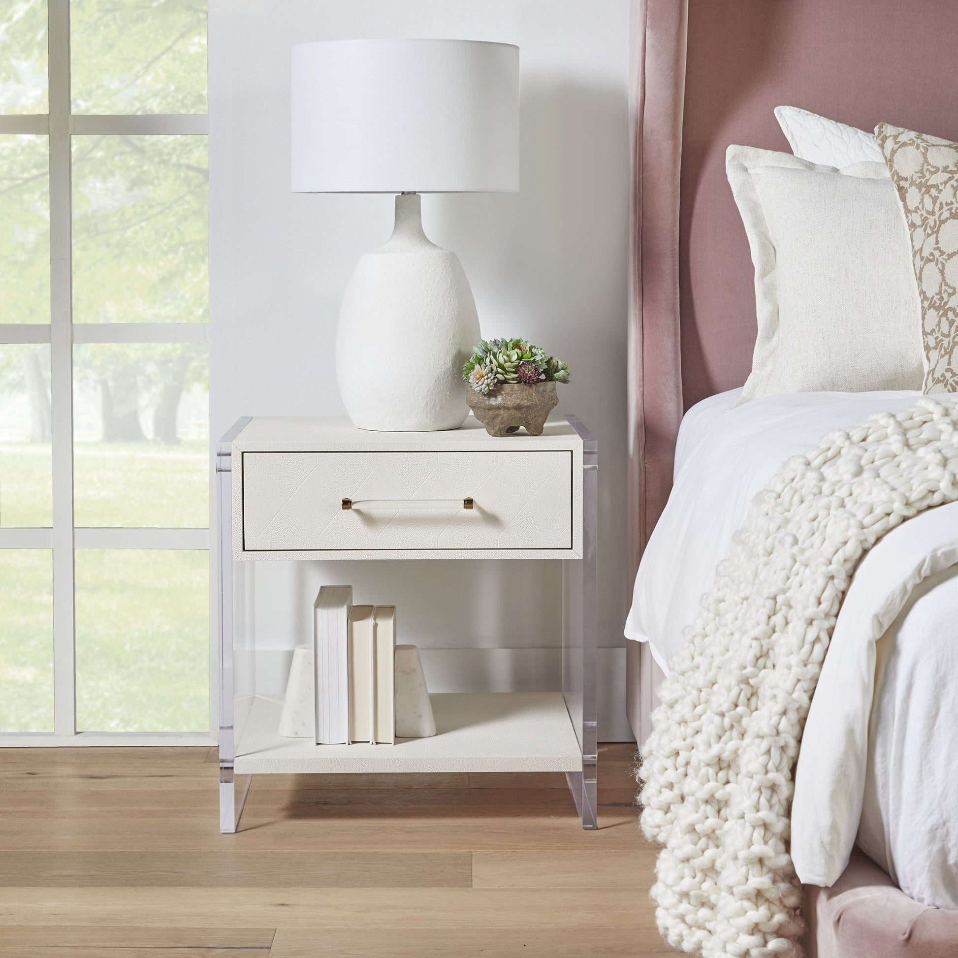 Apportez une touche de luxe raffiné à votre chambre avec la table de chevet 1 tiroir Sonia Shagreen d'Essentials For Living. Magnifiquement confectionnée en résine imitation galuchat blanc perle , en bois d'hévéa , en hêtre et en acrylique transparent , cette pièce allie à la perfection glamour moderne et élégance classique.