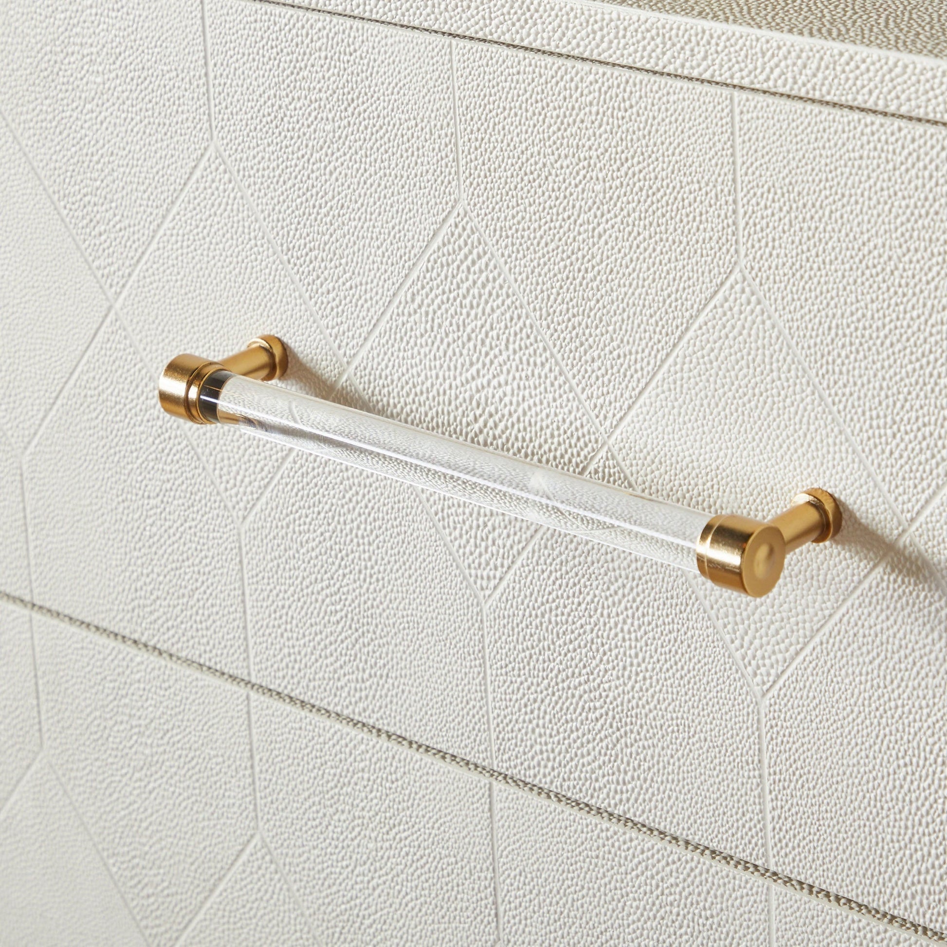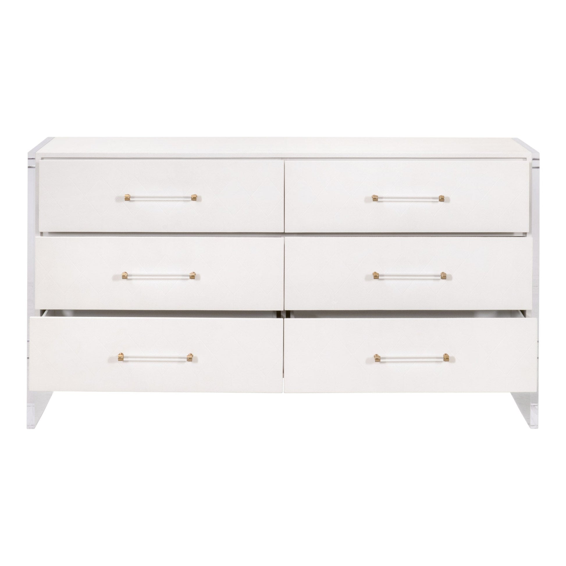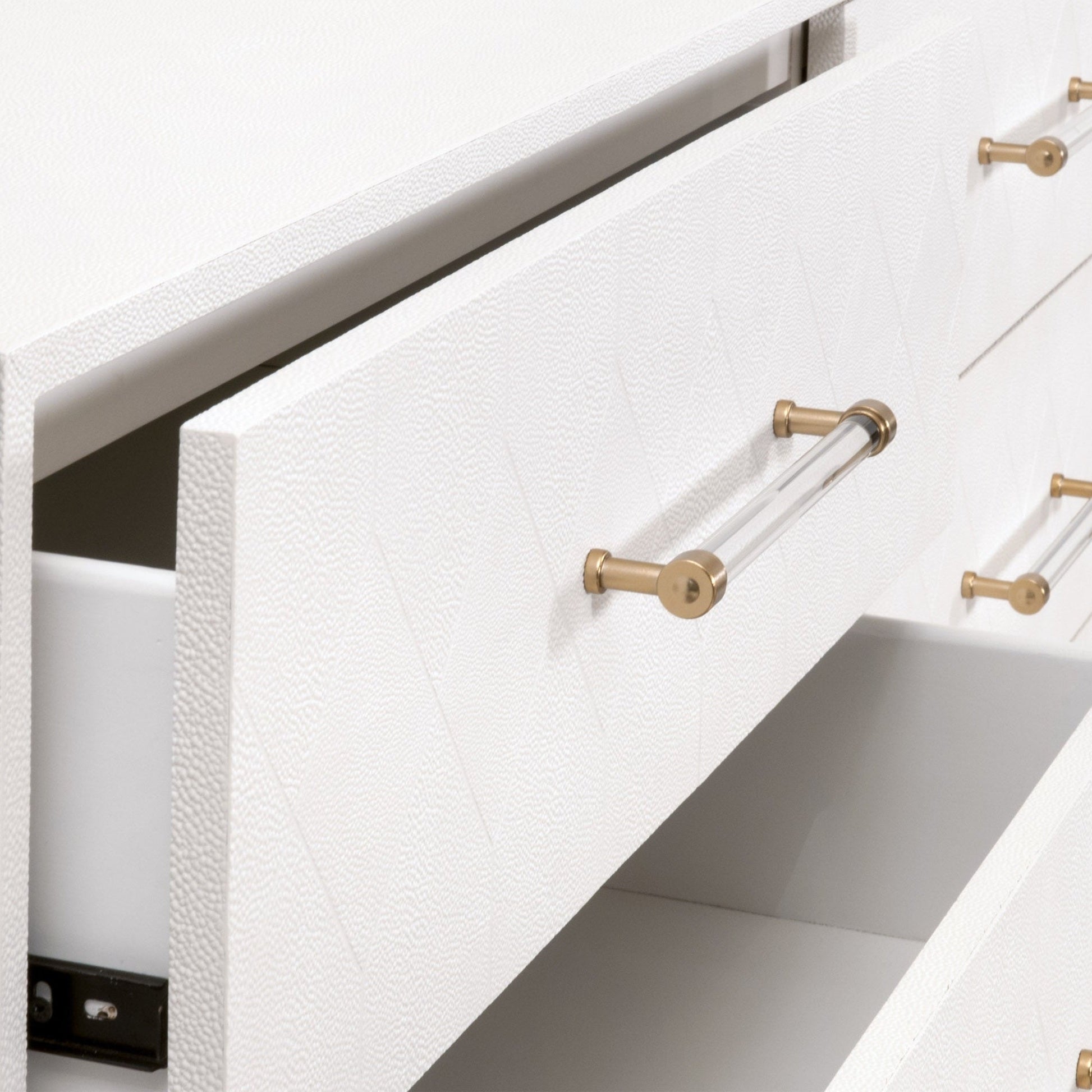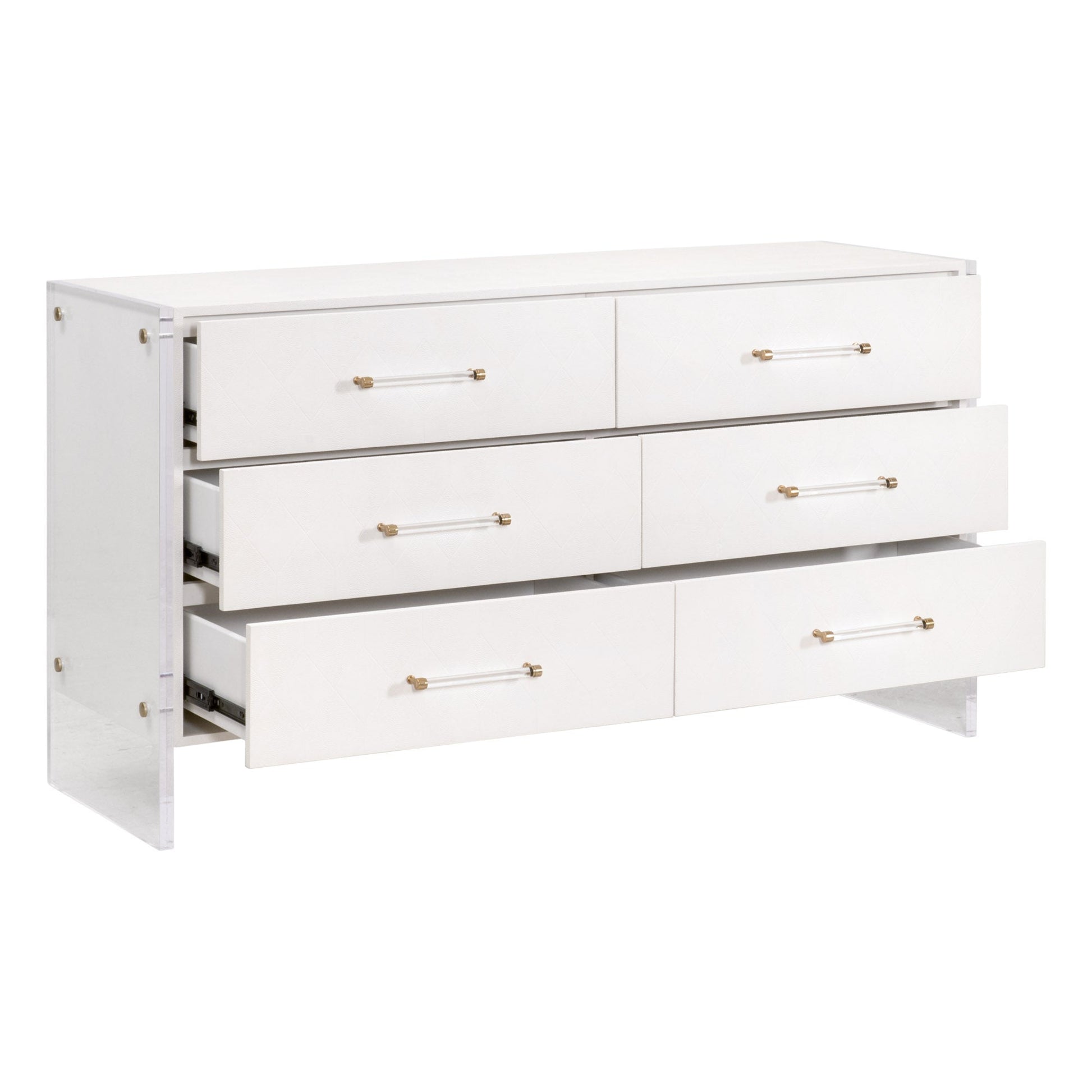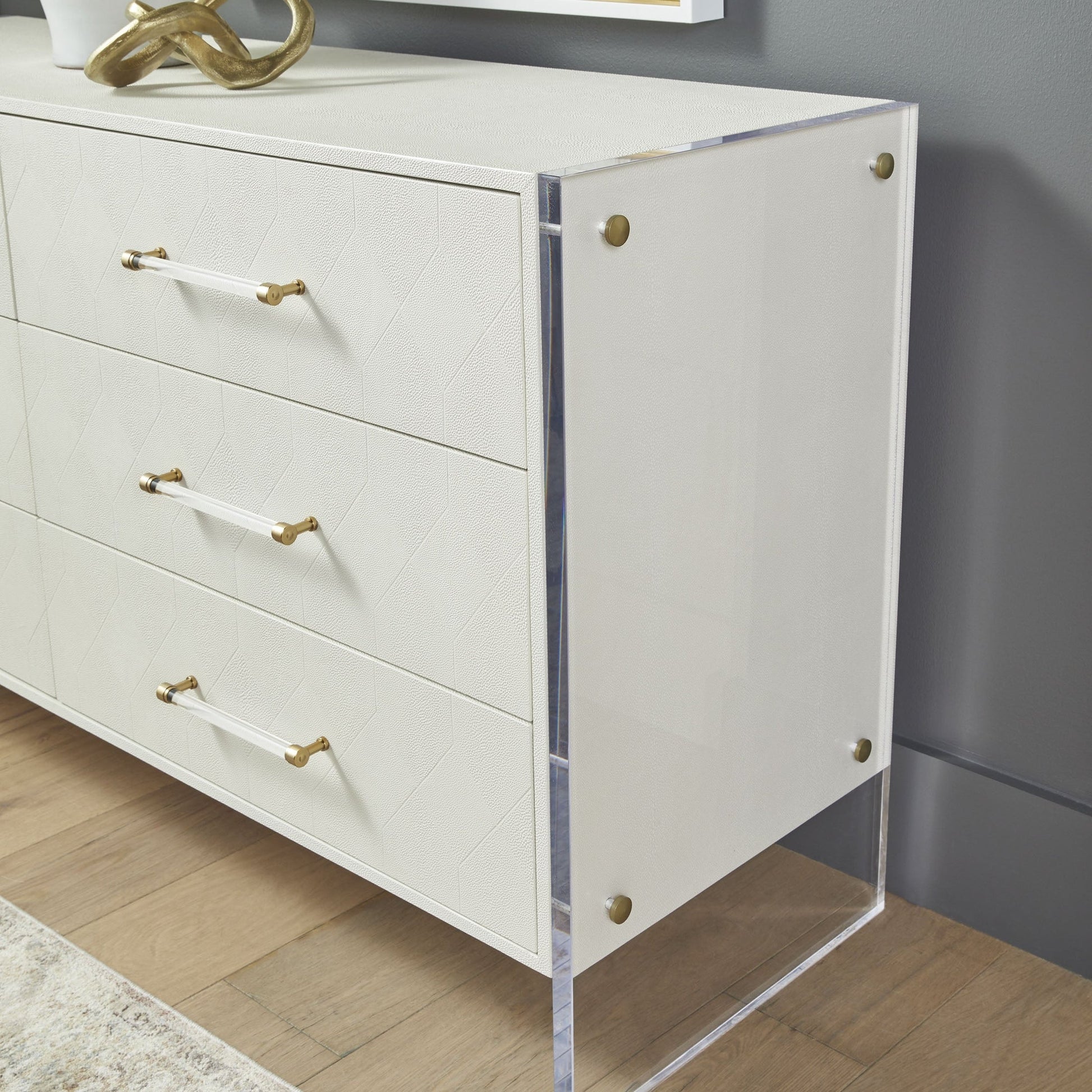 Apportez une élégance raffinée et un glamour moderne à votre chambre avec la commode double 6 tiroirs Sonia Shagreen d'Essentials For Living. Fabriquée en résine imitation galuchat blanc perle , en bois d'hévéa , en hêtre et en acrylique transparent , cette commode allie sophistication transitionnelle et texture luxueuse.
