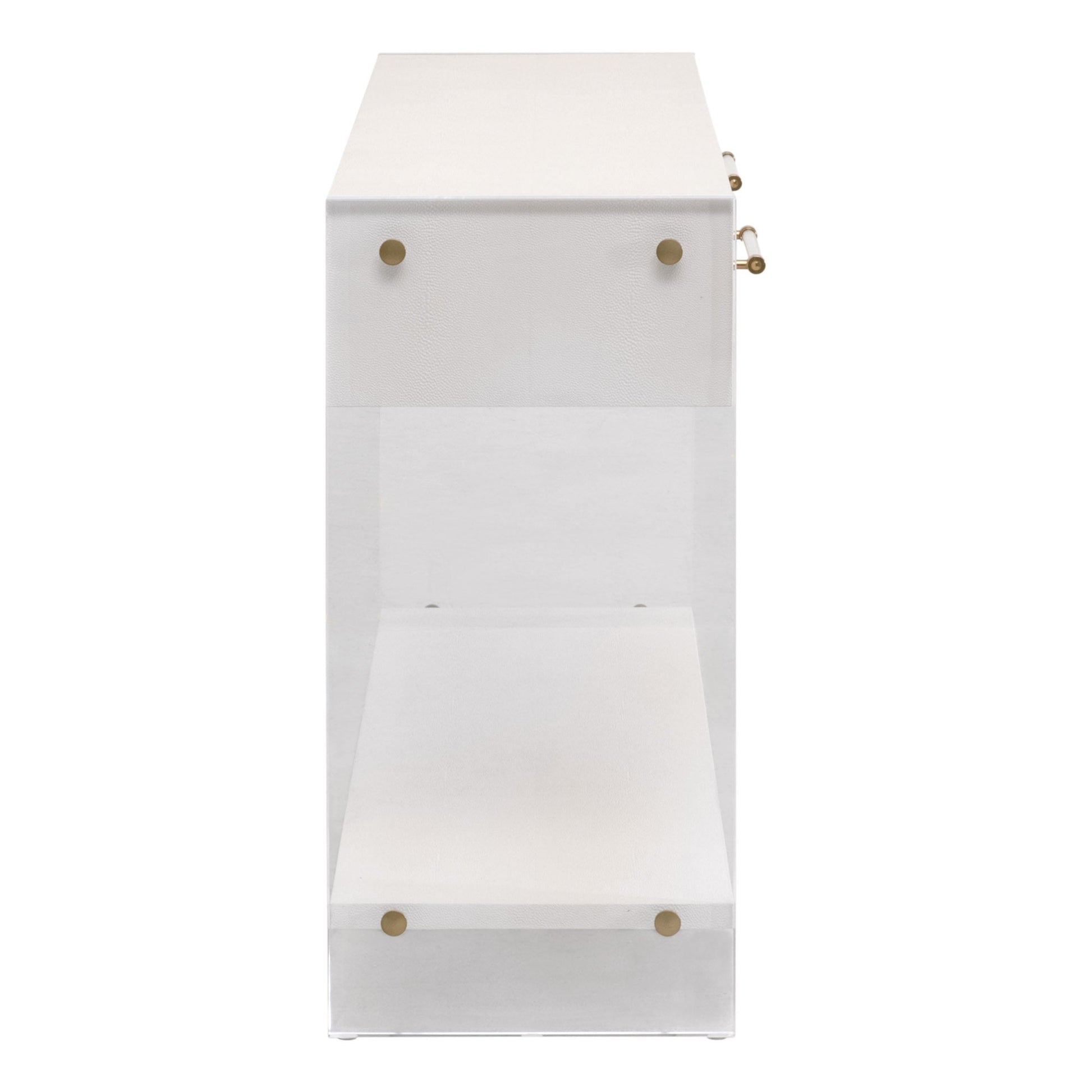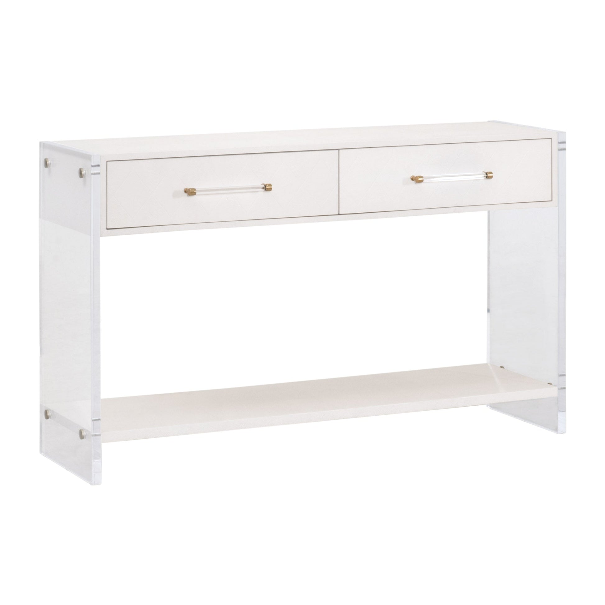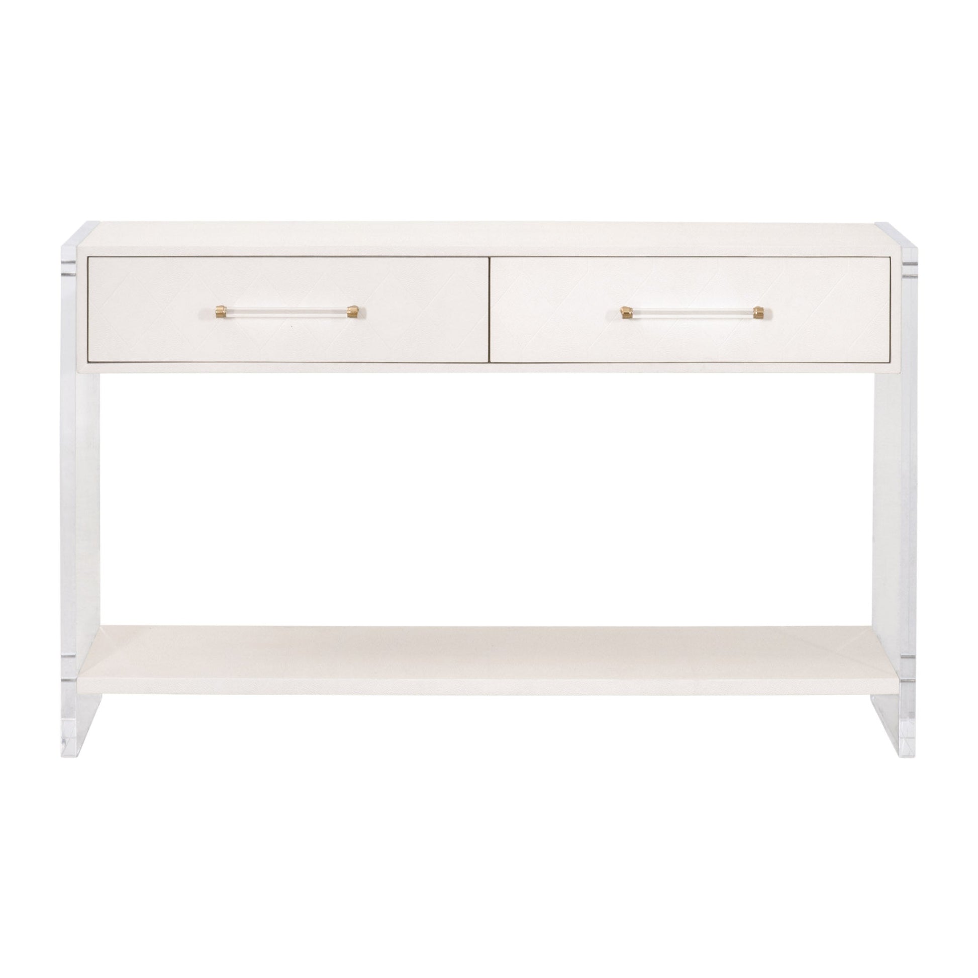 Apportez une élégance raffinée et une touche de sophistication à votre entrée, couloir ou salon avec la console Sonia Shagreen d'Essentials For Living. Cette pièce magnifiquement équilibrée arbore une finition imitation galuchat blanc perle , conçue pour reproduire l'aspect luxueux et le toucher de la véritable peau de raie, offrant une texture organique et un savoir-faire raffiné.