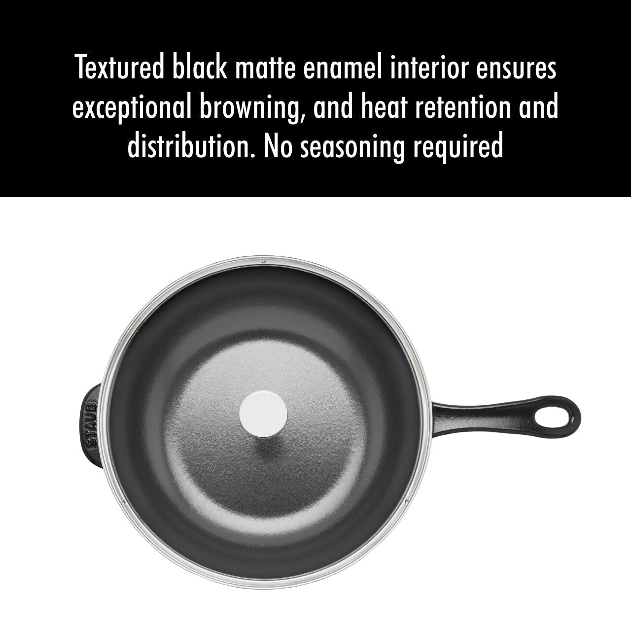 - L'intérieur en émail noir mat texturé ne nécessite aucun assaisonnement et assure un brunissement exceptionnel, ainsi qu'une rétention et une distribution de la chaleur