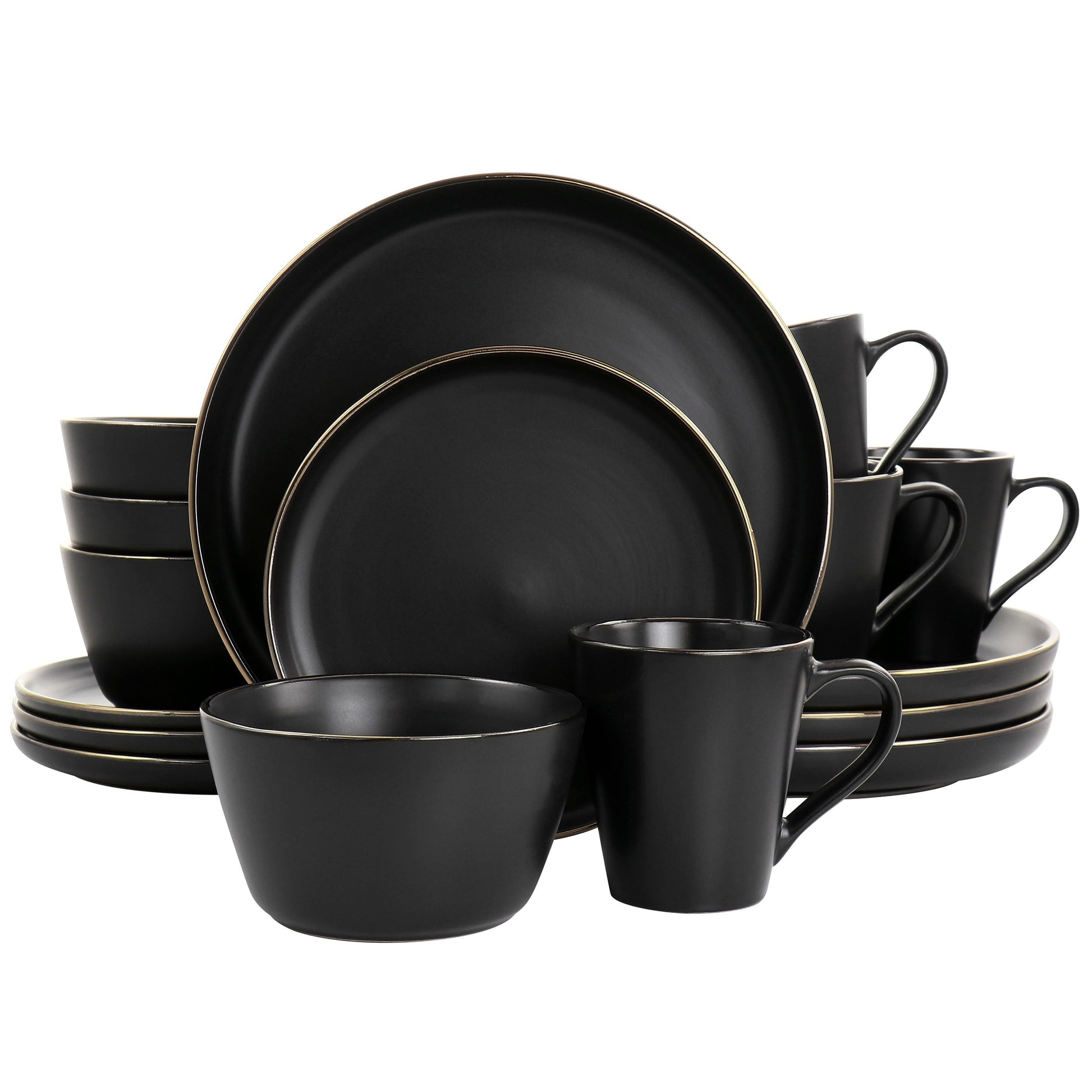 Ajoutez une touche d'élégance à votre table avec ce service de table rond en grès de 16 pièces, d'un noir mat raffiné avec un liseré doré. Chaque plat est conçu avec créativité, avec une base plate unique, un bord surélevé et une bordure dorée. Magnifiquement orné d'un fin et élégant liseré doré, ce service est une pièce maîtresse. Fabriqué en grès, il est idéal pour les occasions spéciales et robuste pour un usage quotidien. Chaque assiette passe au micro-ondes pour un réchauffage rapide et au lave-vaisselle pour un nettoyage facile.