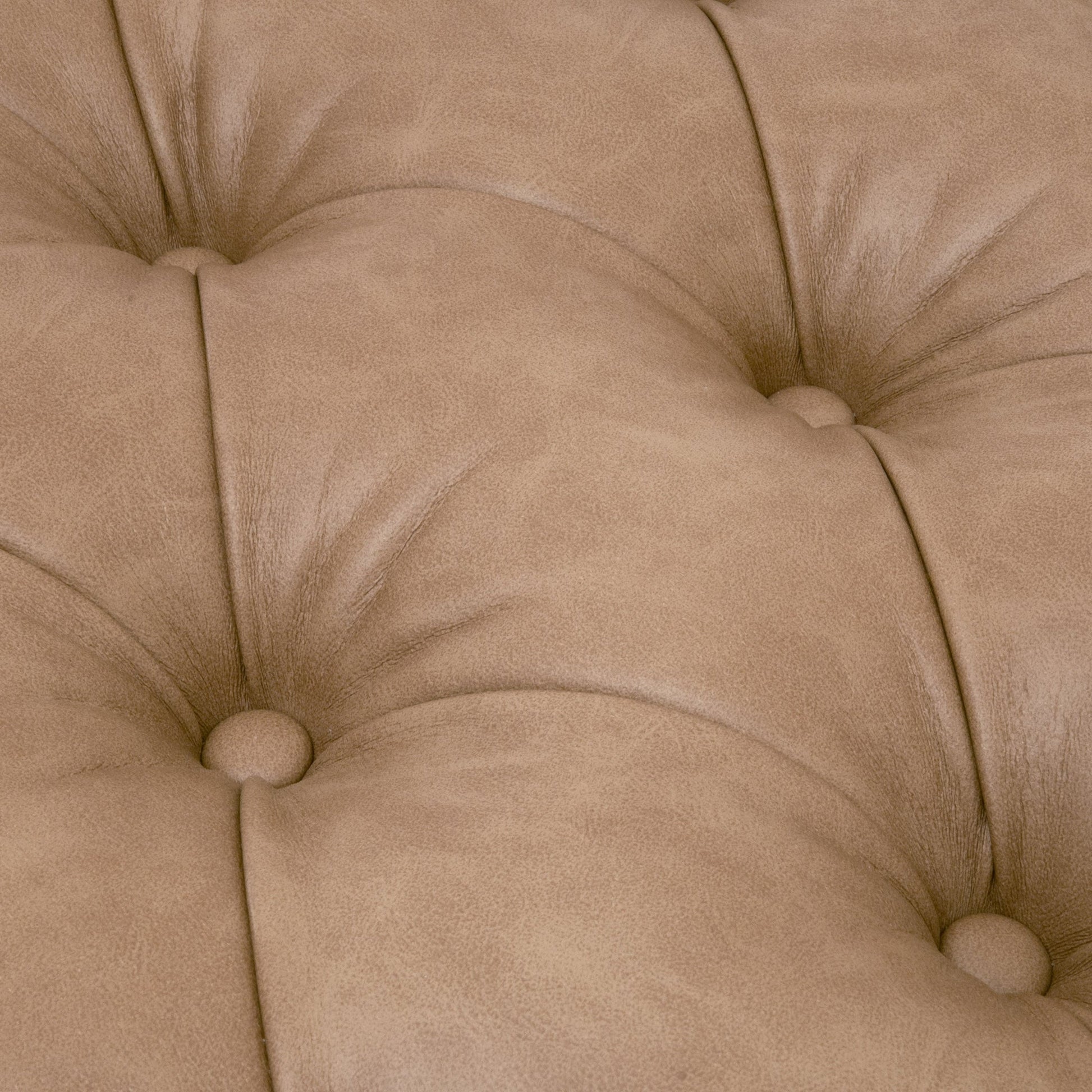 Le plateau rembourré est recouvert de cuir vegan Ivanhoe Toast marron intense, composé à 84 % de polyester et à 16 % de PU, et rehaussé d'élégants détails capitonnés. Mesurant 137 cm de large, 86 cm de profondeur et 45 cm de haut, cette table basse est dotée de pieds tournés magnifiquement travaillés, d'une étagère de rangement pratique et de clous noirs individuels, ce qui en fait une pièce maîtresse à la fois sophistiquée et pratique.