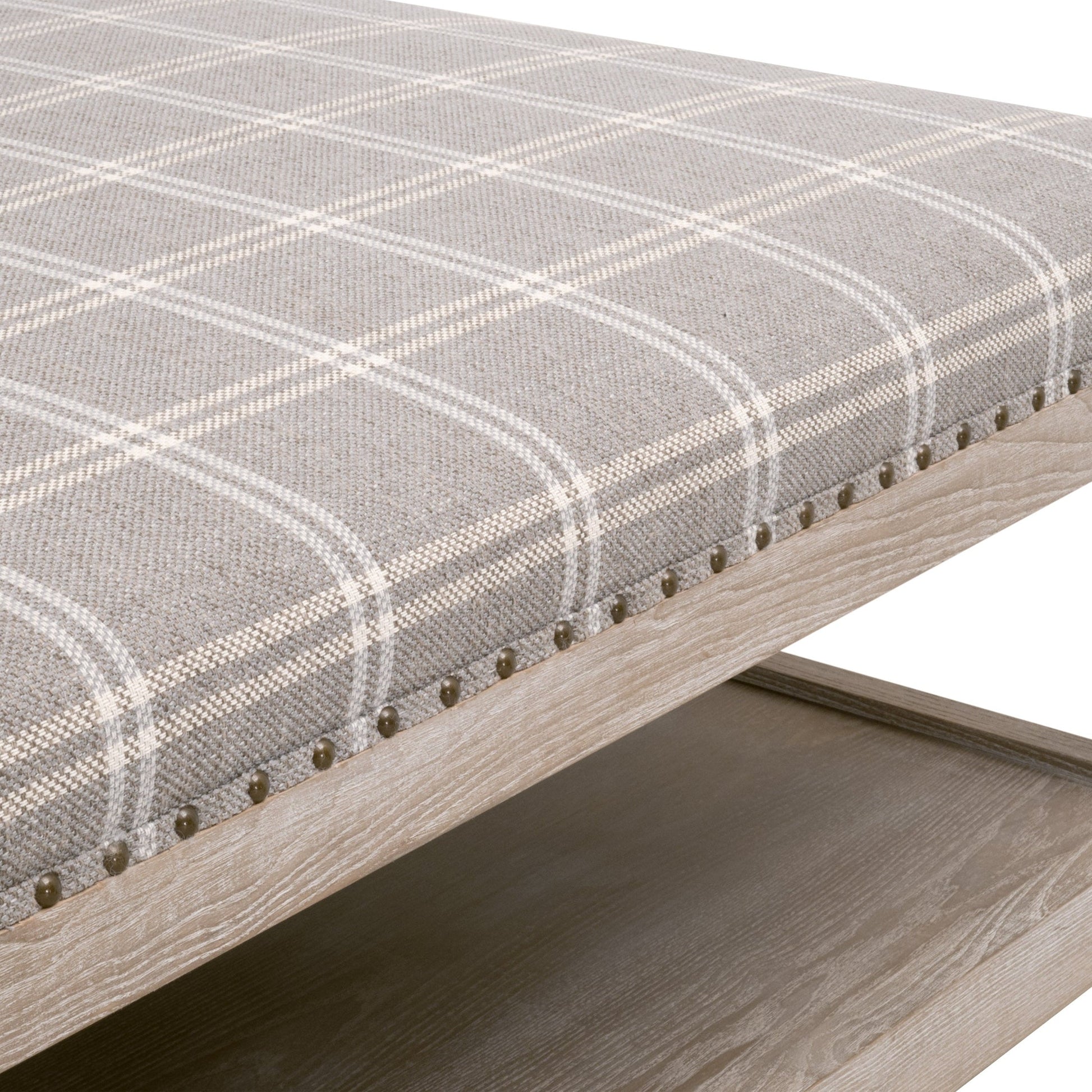 Le tissu résistant et antitache est conçu pour résister à un usage quotidien tout en conservant son aspect soigné. Une finition cloutée dorée apporte une touche raffinée, sublimant le motif écossais d'une subtile sophistication. Sous le plateau rembourré, un cadre en frêne gris naturel massif aux pieds tournés confère à la table un caractère classique, tandis que l' étagère inférieure en bois offre un espace pratique pour des objets de décoration, des livres ou des paniers de rangement.