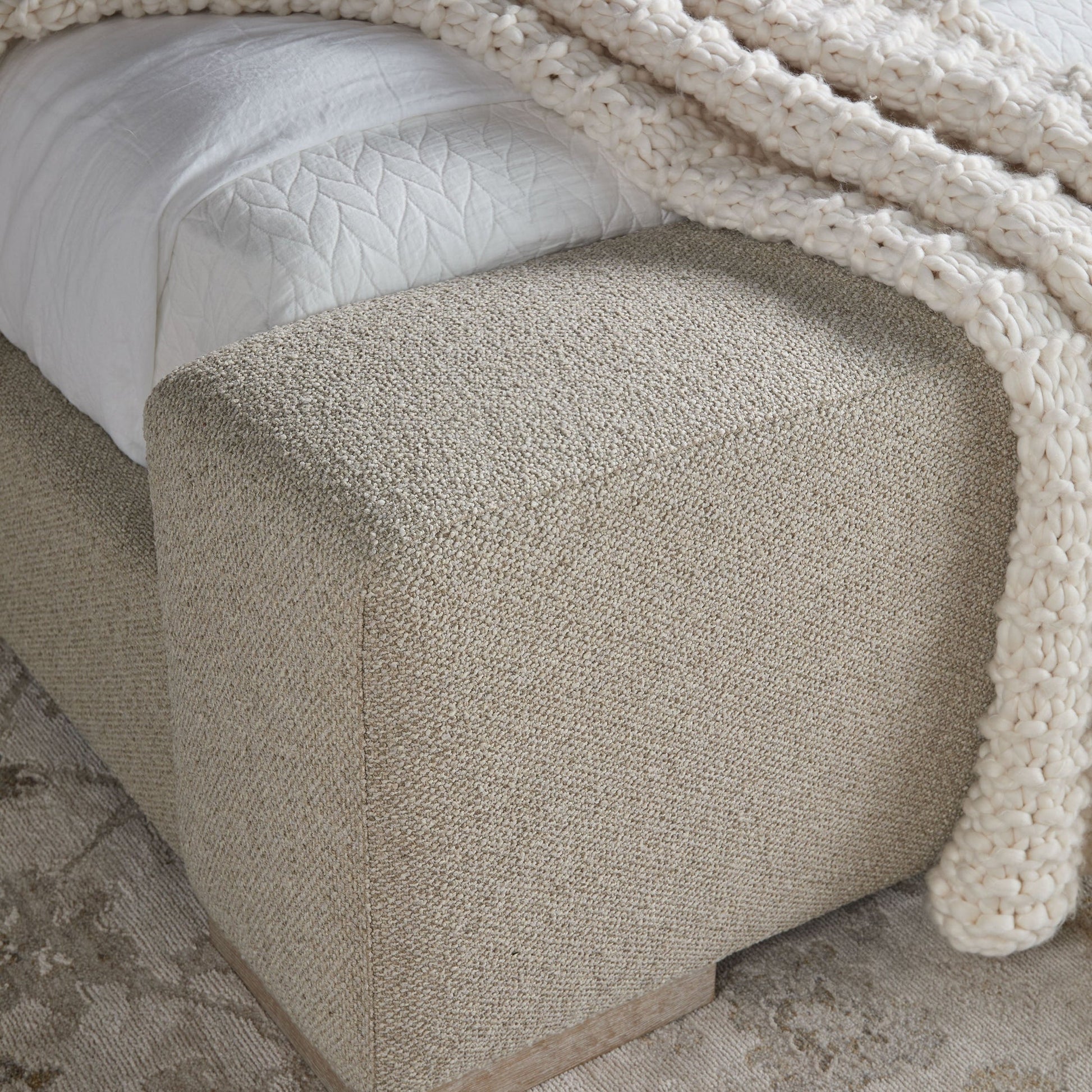 Des tons clairs et des lignes épurées créent une atmosphère détendue et accueillante, tandis que le pied de lit extra-large fait office de banc de chevet fonctionnel. Les pieds apparents en chêne massif, d'une finition gris naturel, offrent un contraste saisissant qui rehausse l'élégance de l'ensemble.