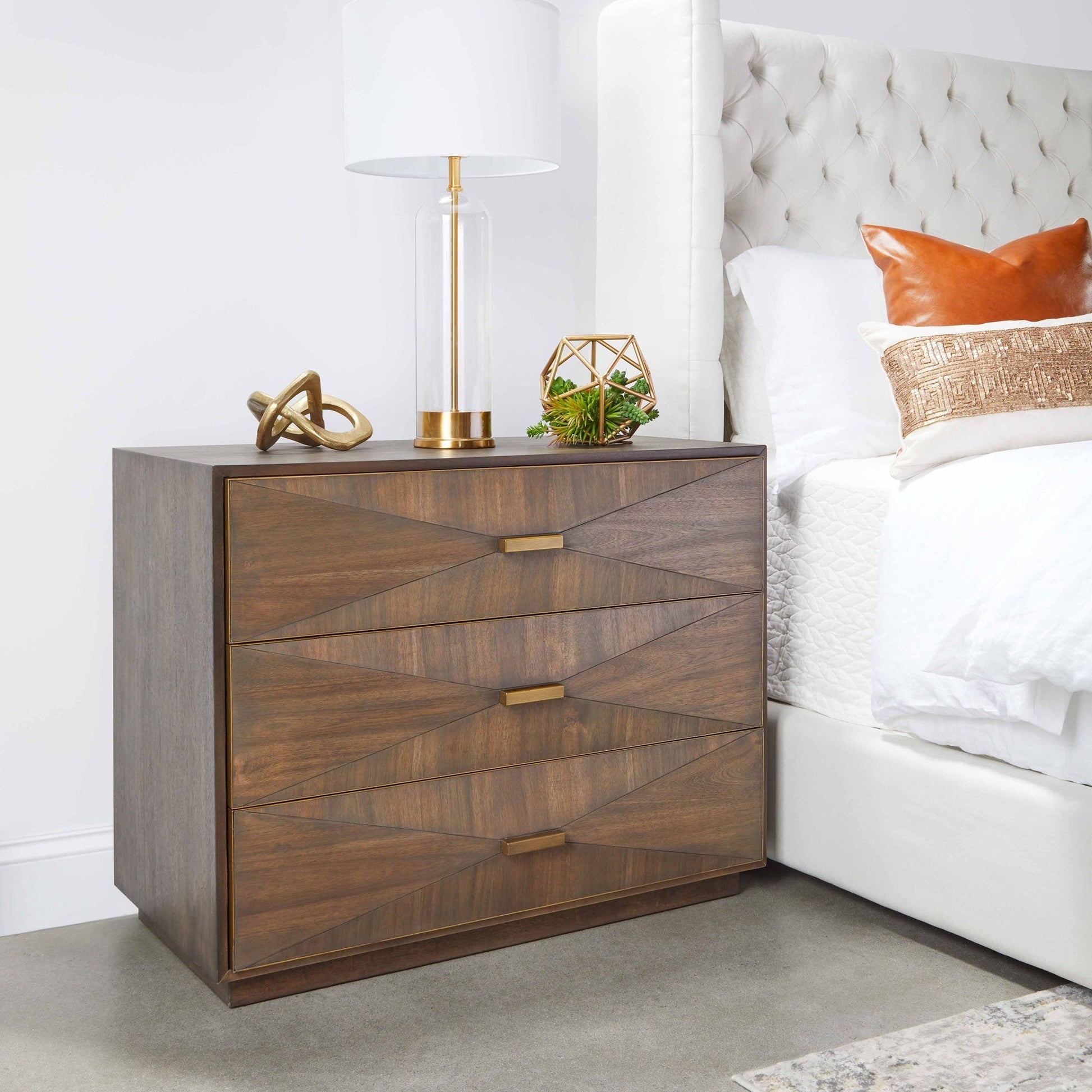 Ajoutez profondeur, chaleur et élégance à votre chambre avec la table de chevet 3 tiroirs Wynn d'Essentials For Living. Ce meuble transitionnel arbore un placage d'acacia brun richement poli , des tons boisés superposés et une superbe façade de tiroir texturée en 3D qui apporte une touche artistique à un rangement fonctionnel.