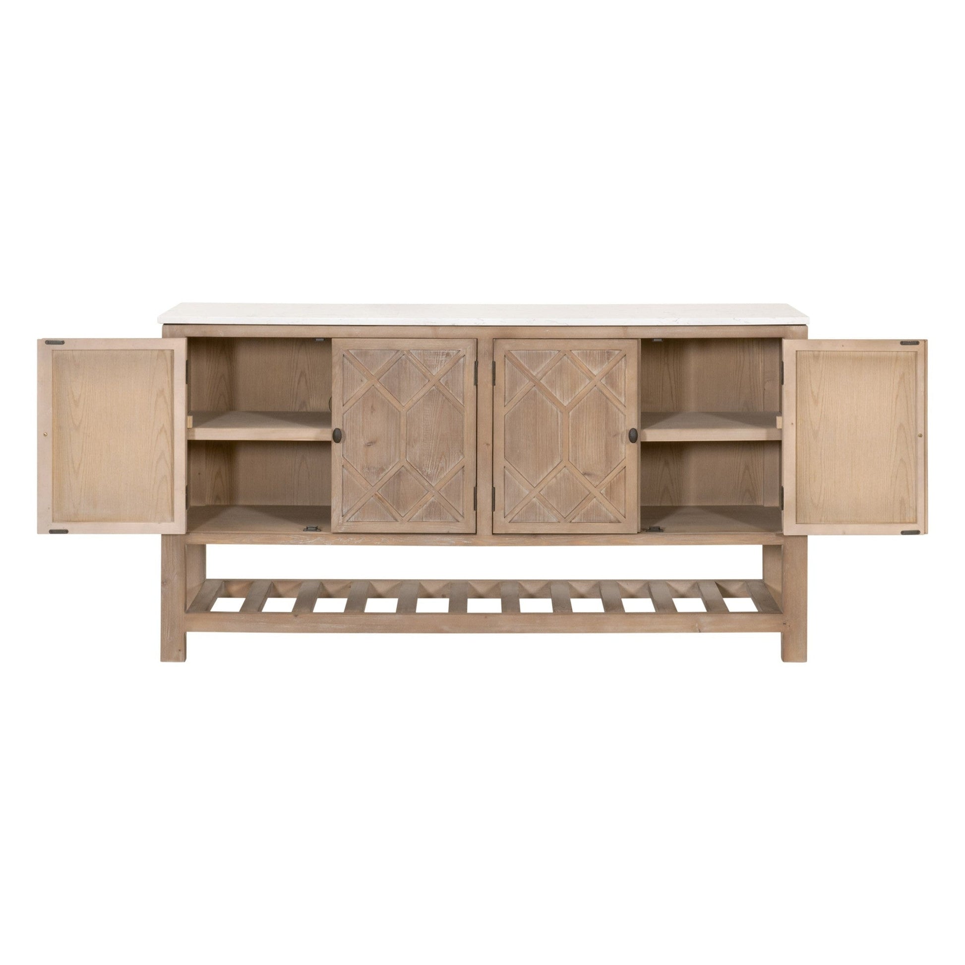 Doté d'un plateau en quartz massif imitant le marbre blanc et gris, le buffet repose sur un piètement en pin massif recyclé, à la finition gris fumé raffinée. Le piètement à tréteaux apporte un charme rustique subtil, tandis que les portes à motifs de losanges rehaussent l'esthétique générale.