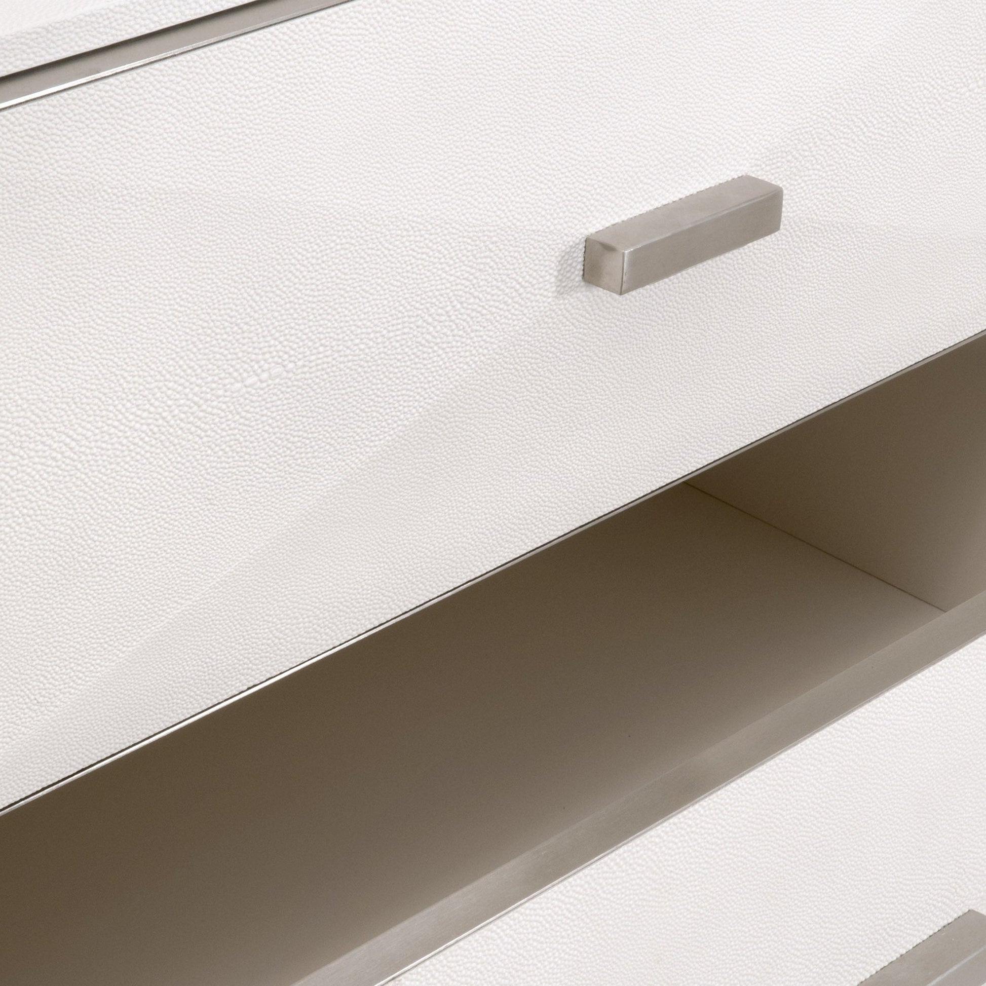 Résine imitation galuchat nacré et acier inoxydable brossé | Tiroirs doublés de feutre | Luxe transitionnel